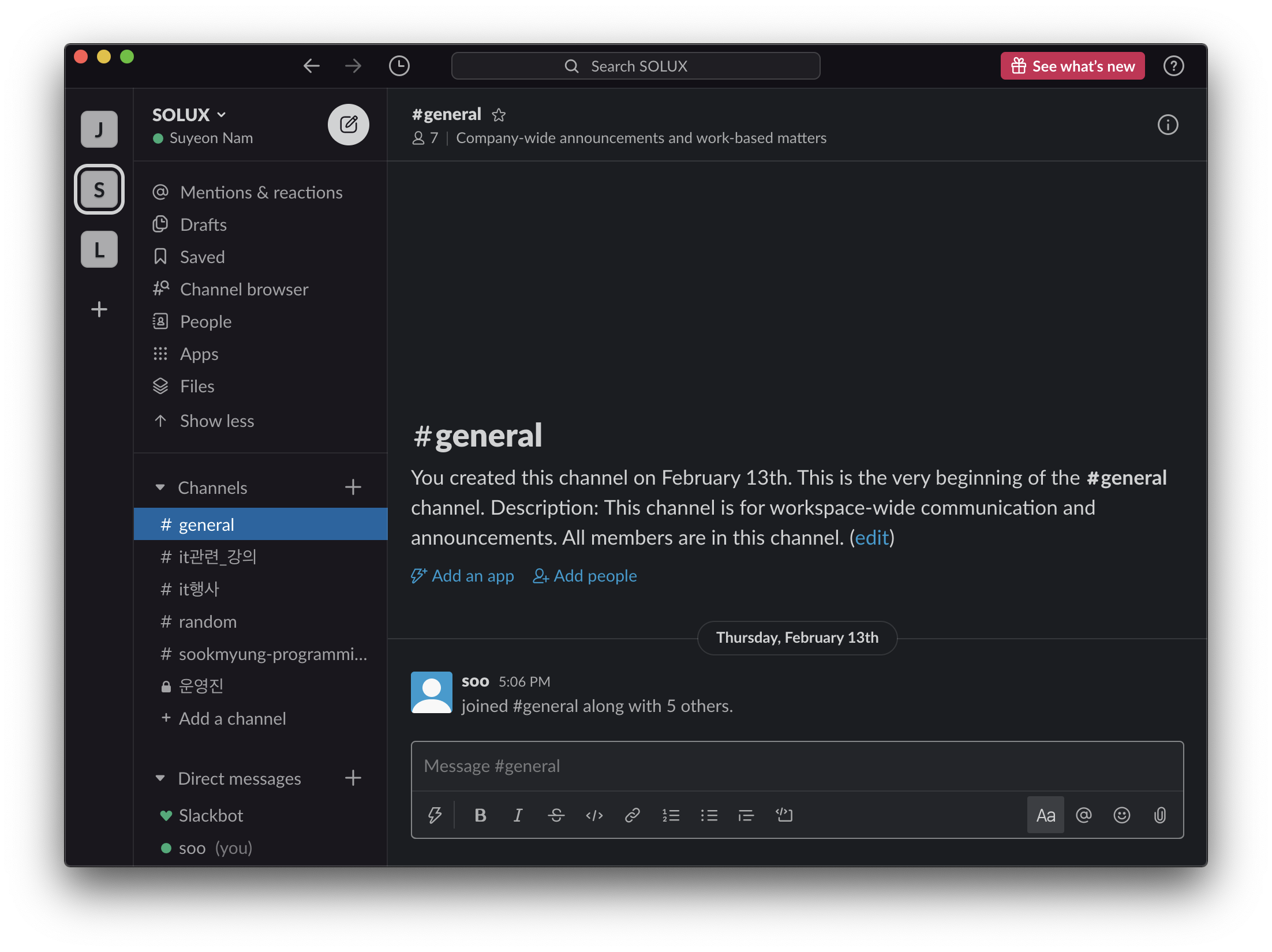 - 자기소개 : 온라인으로 여러분끼리의 친목을 도모할 기회를 드리고 싶어 생성한 채널입니다. 25기 회원으로서의 첫 과제는 솔룩스 슬랙의 자기소개 채널에 자기소개 쓰기랍니다.