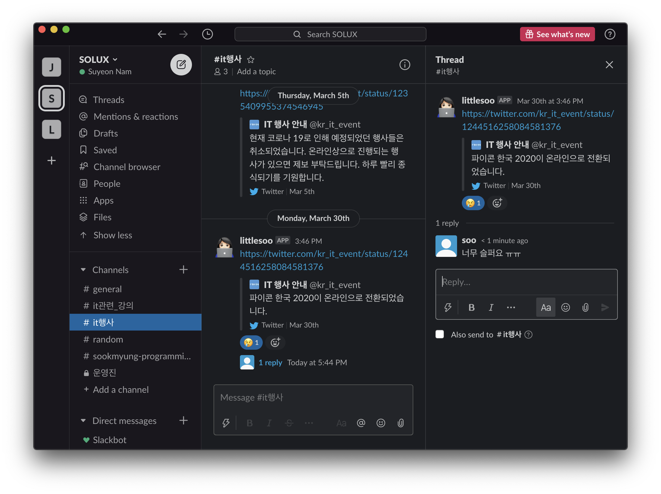 - it행사 : littlesoo 라는 봇이 동작하고 있는 IT 행사 안내 채널입니다. 기본적으로 이 채널에서 대화는 금지입니다.