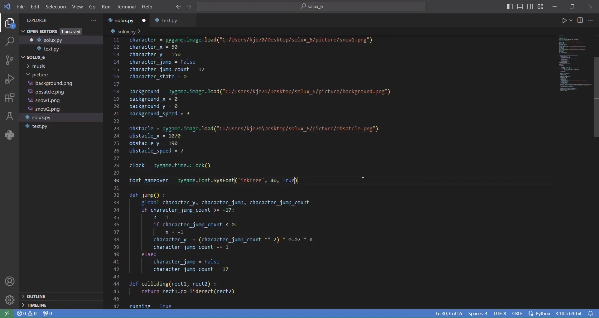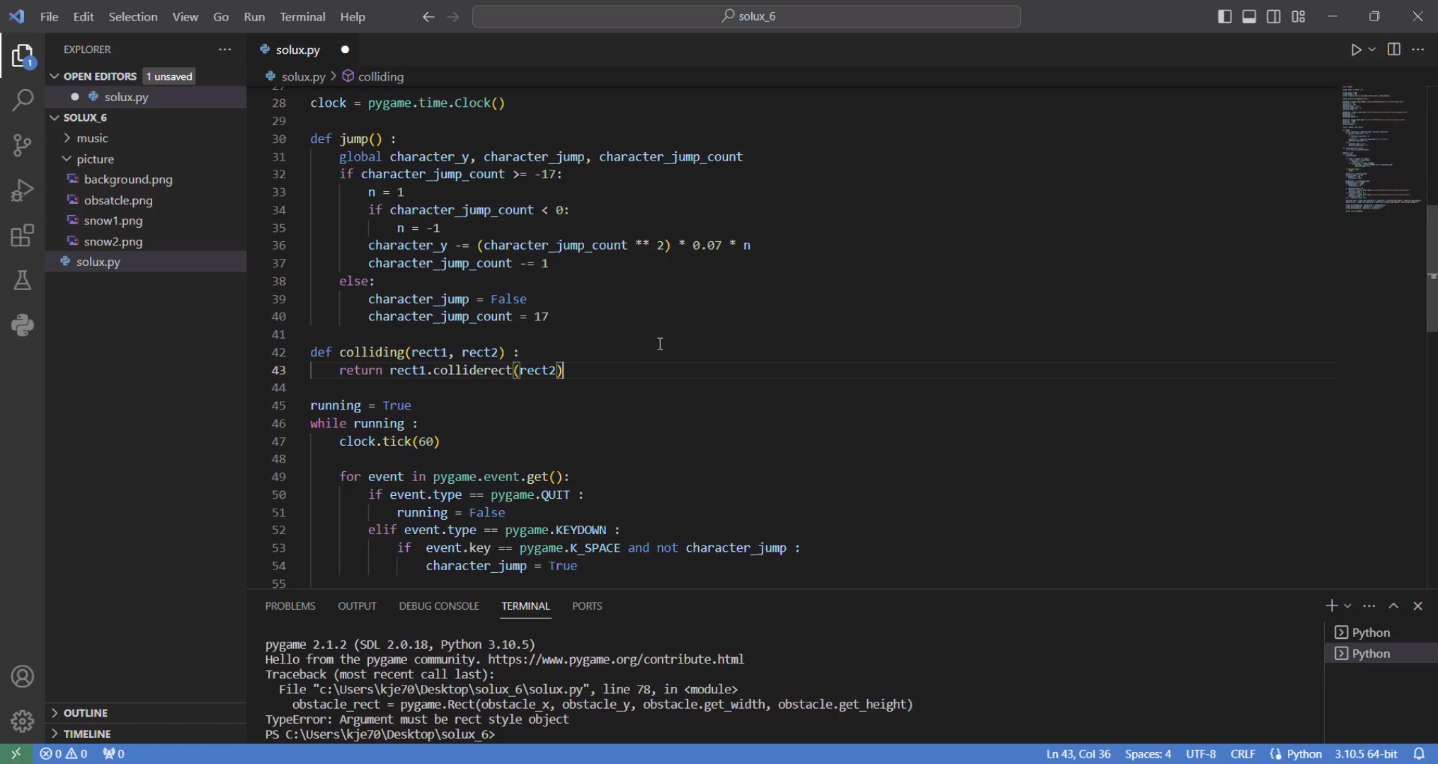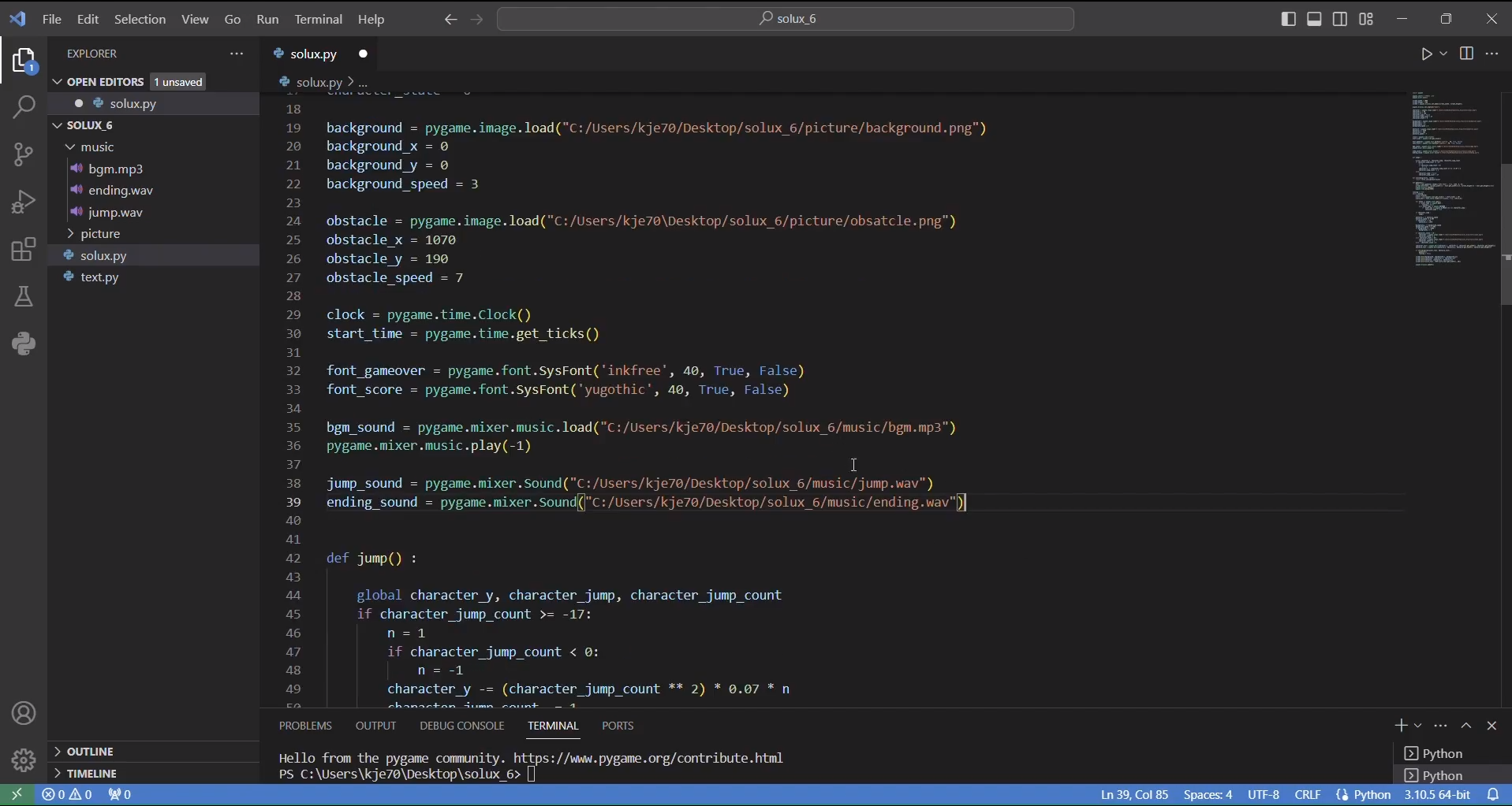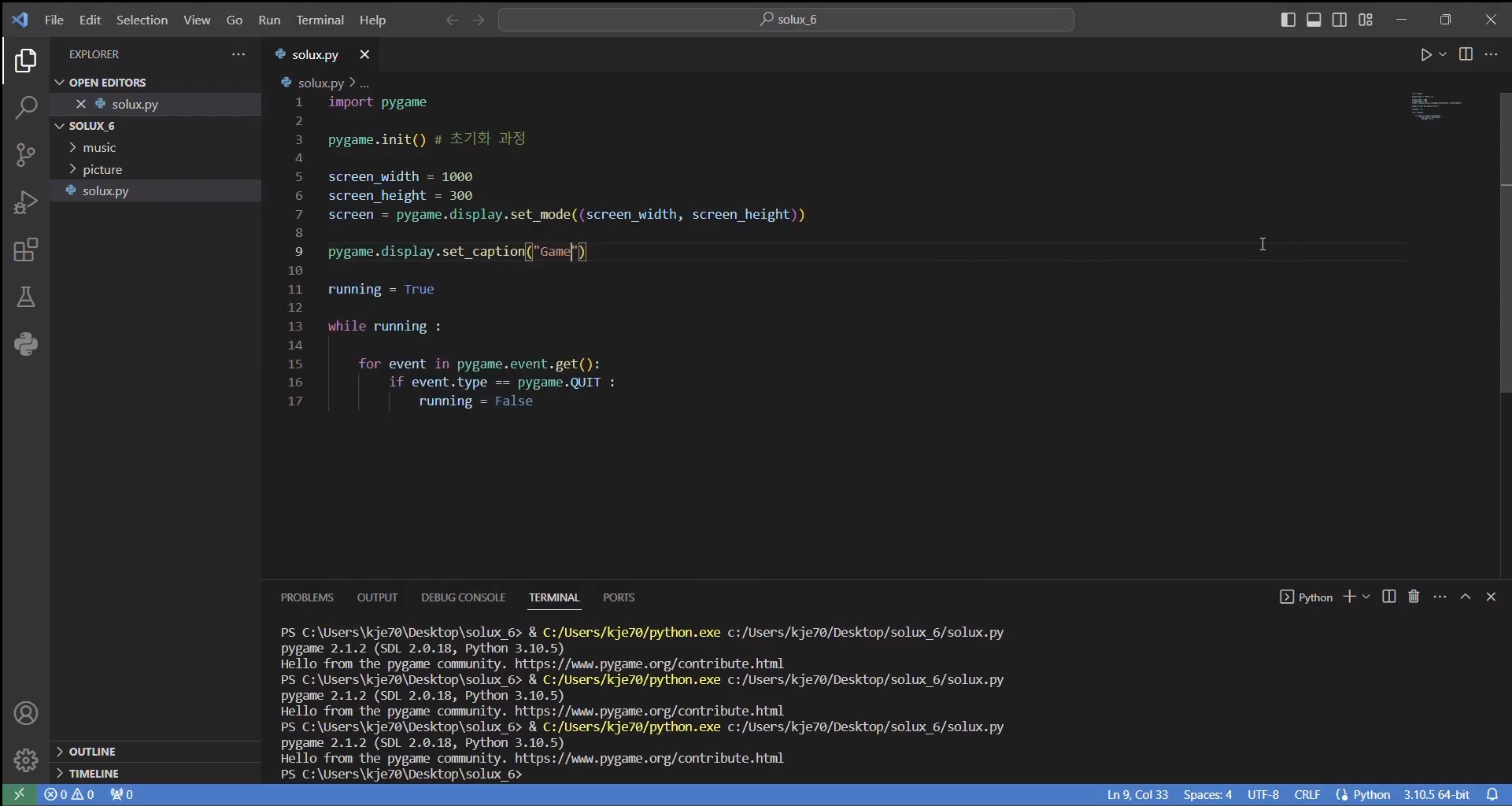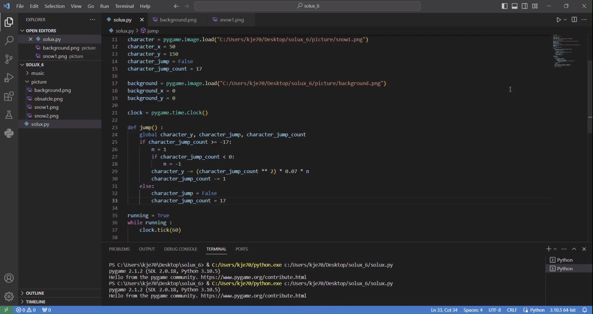 2-1. 파이게임 설치 및 창 띄우기, 캐릭터와 배경을 띄워 점프 기능을 구현해봅니다.
