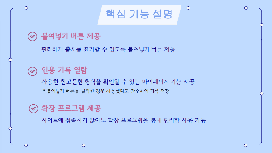 - API를 사용하여 논문, 책, 뉴스의 출처 표기법에 따른 참고문헌 형식 제공