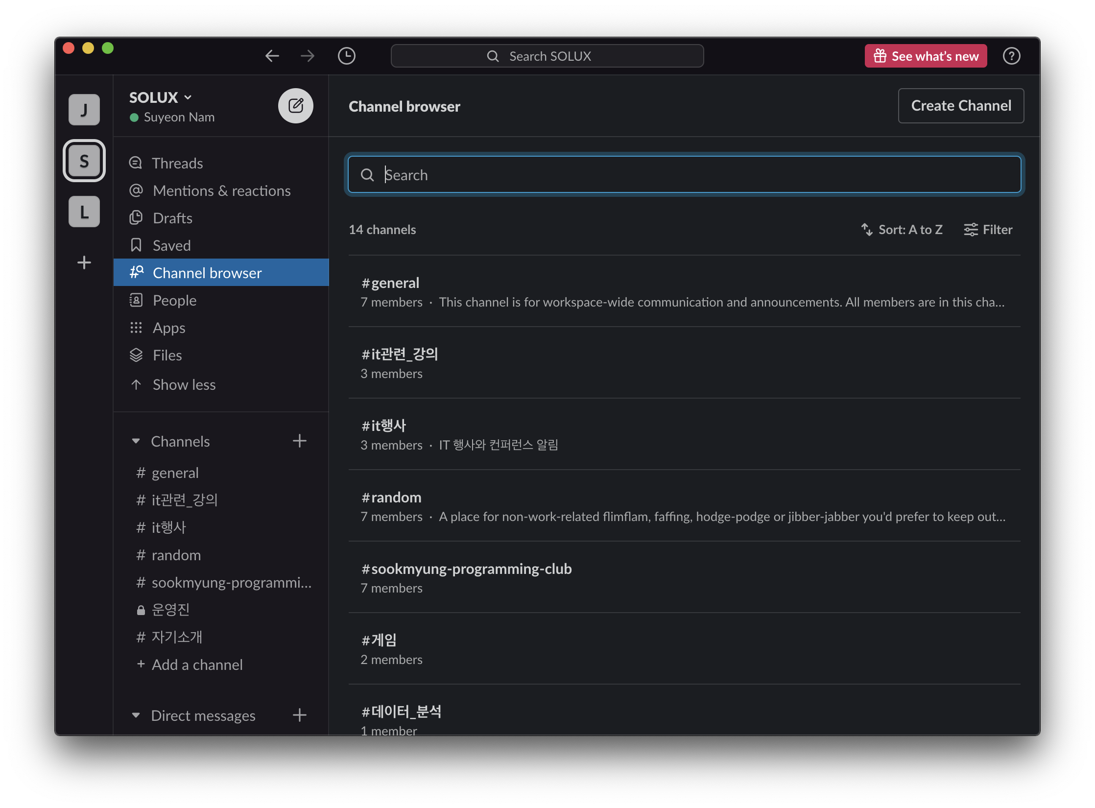 - 자기소개 : 온라인으로 여러분끼리의 친목을 도모할 기회를 드리고 싶어 생성한 채널입니다. 25기 회원으로서의 첫 과제는 솔룩스 슬랙의 자기소개 채널에 자기소개 쓰기랍니다.