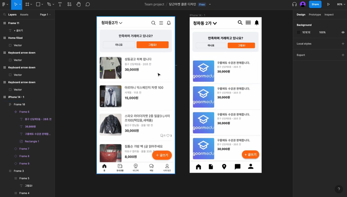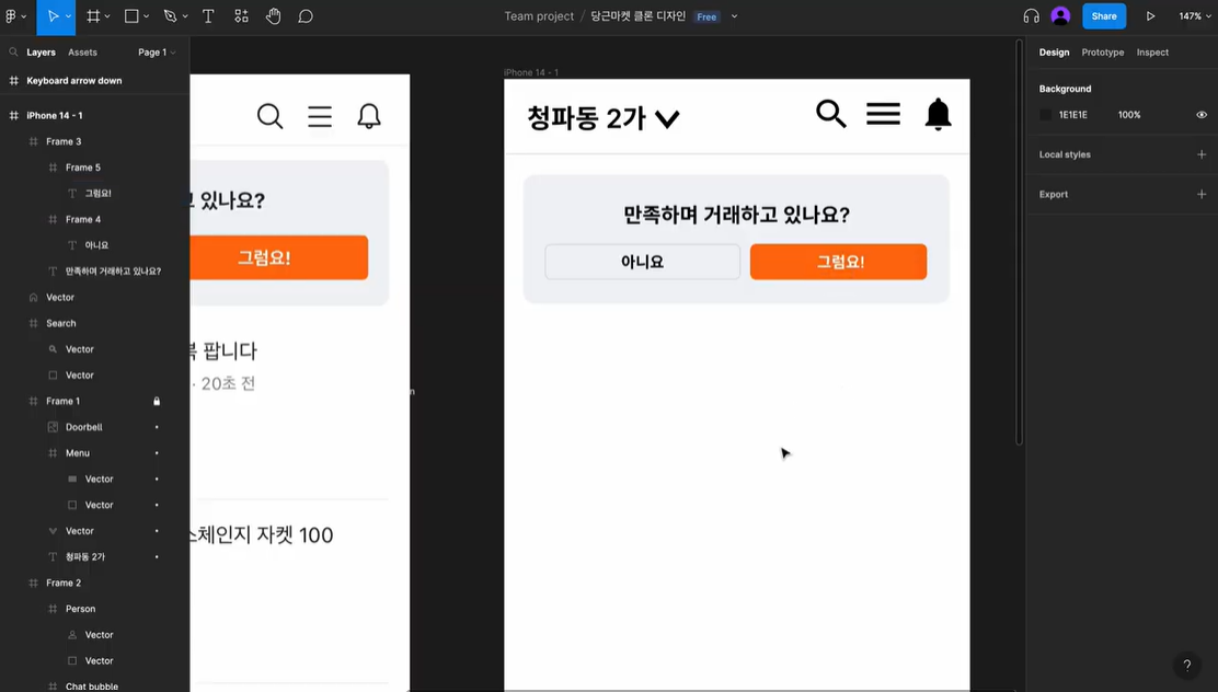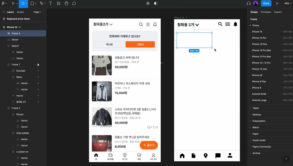 먼저, 당근마켓 앱의 캡처 이미지를 불러와서 아이폰 14 프레임에 맞춰 디자인을 시작합니다.