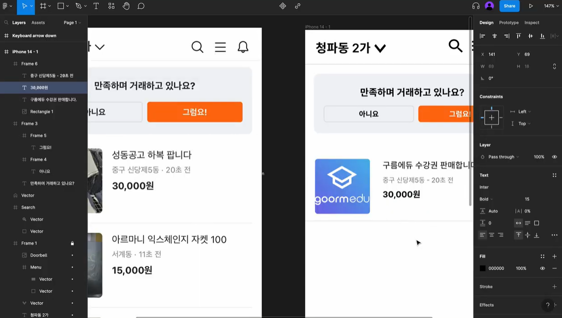 이런 식으로 영상을 차근차근 따라 하면서, 피그마의 다양한 기능을 직접 익혀보는 시간을 가져보았습니다.