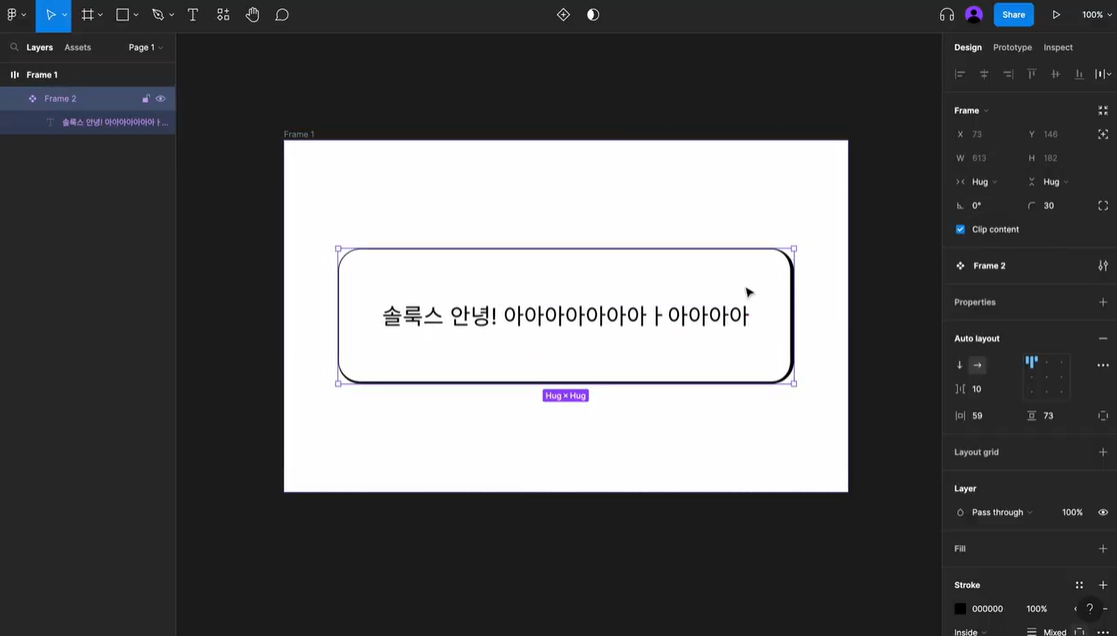 예를 들어, 텍스트 박스를 만들어서 오토 레이아웃을 설정하면 텍스트 길이에 따라 자동으로 크기가 조절됩니다.