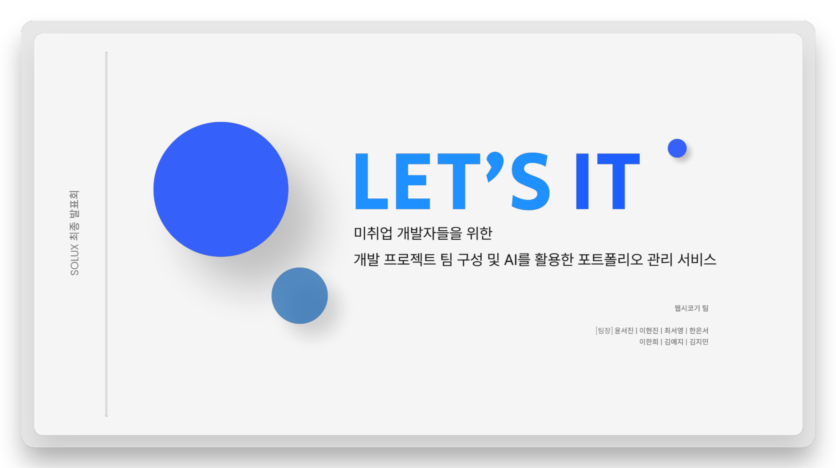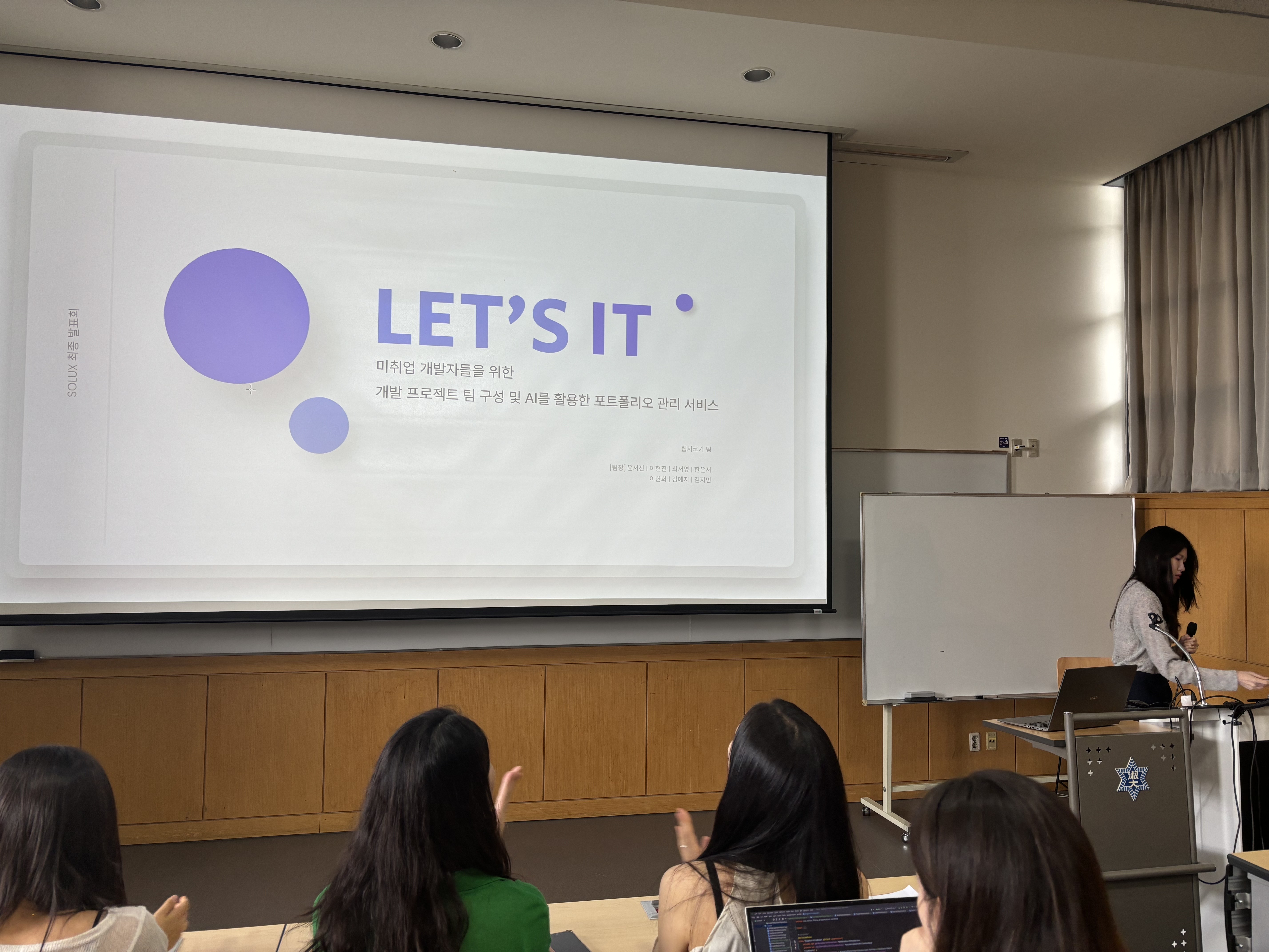 우수상 수상작은 미취업 개발자들을 위한 개발 프로젝트 팀 구성 및 AI를 활용한 포트폴리오 관리 서비스, Let's IT이었습니다.