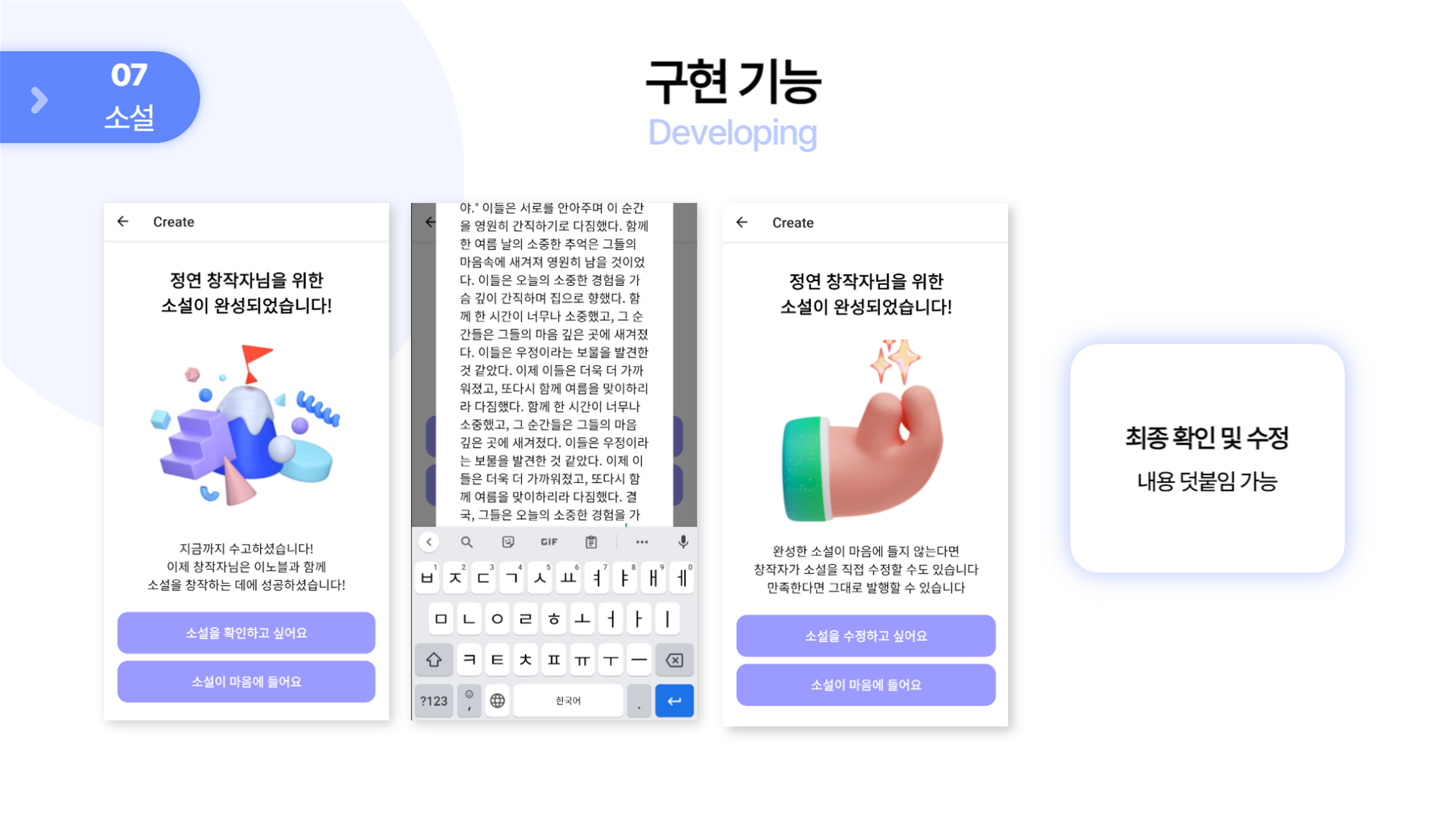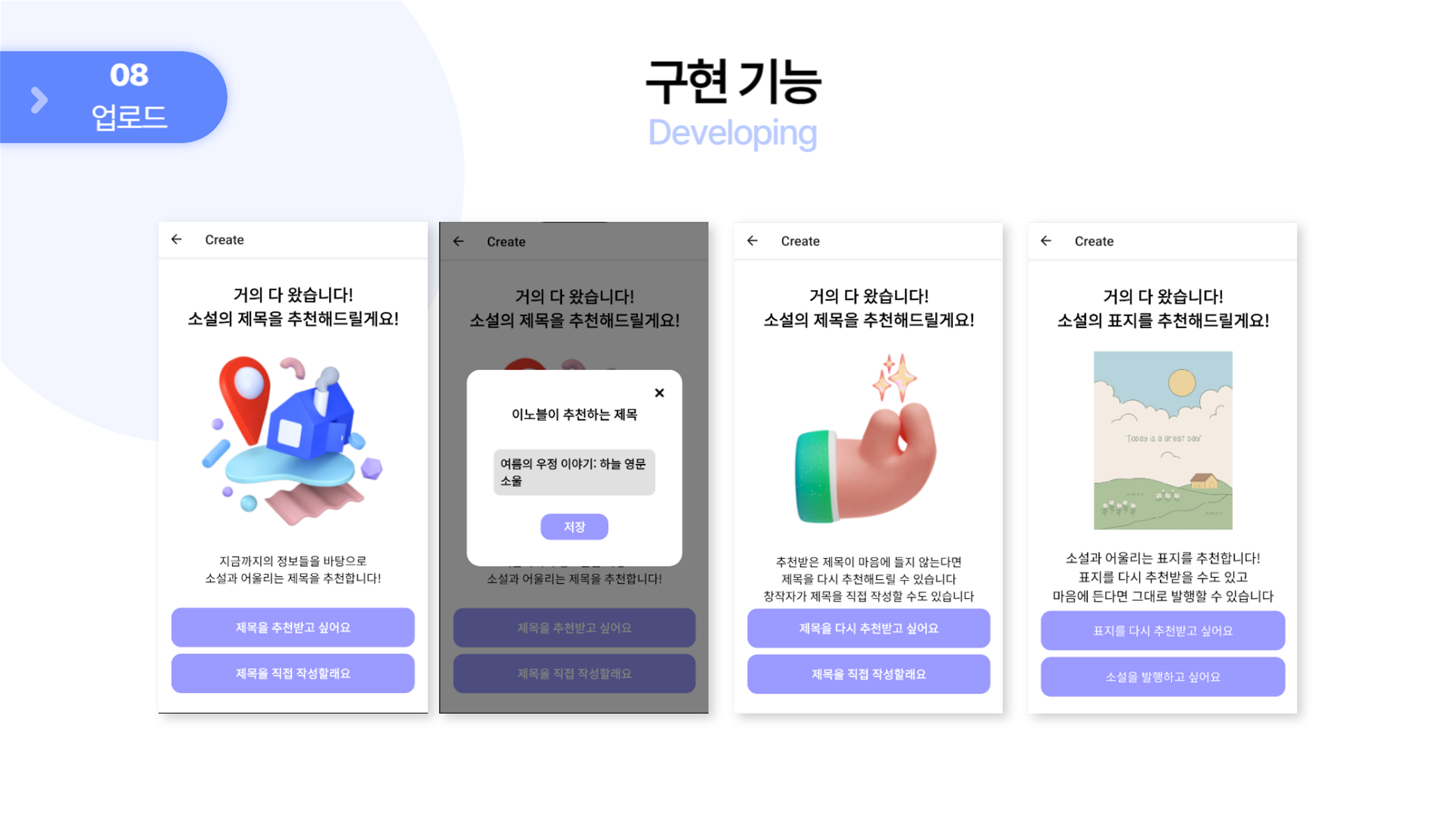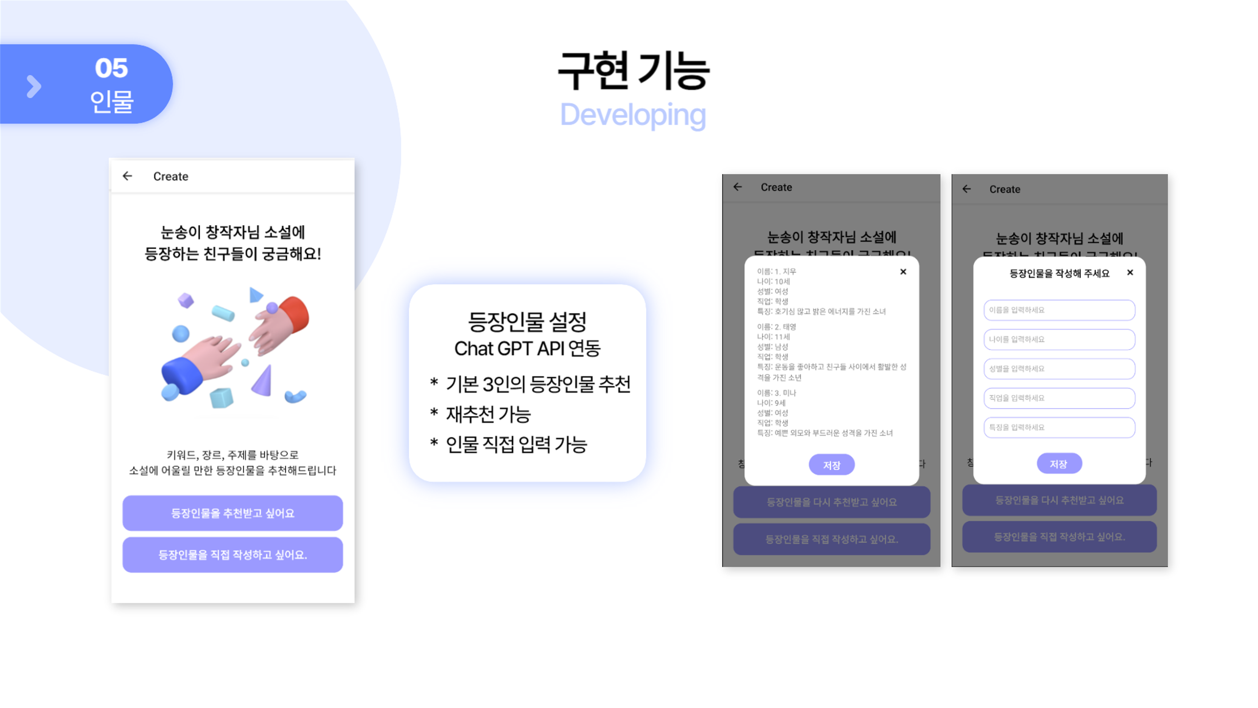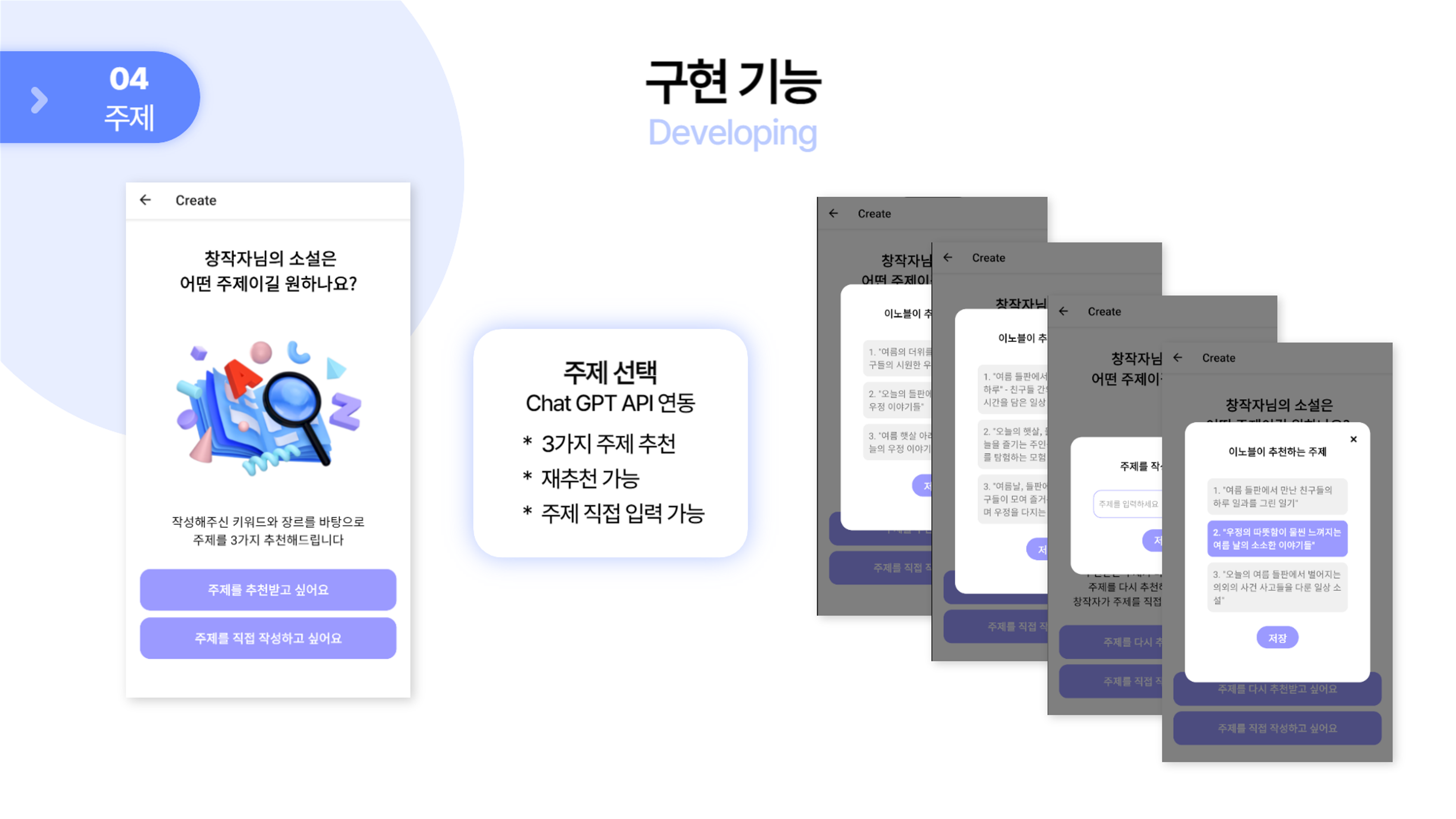 - Chat GPT API 연동 기능 구현 - 주제 추천 및 재추천, 등장인물 추천 등