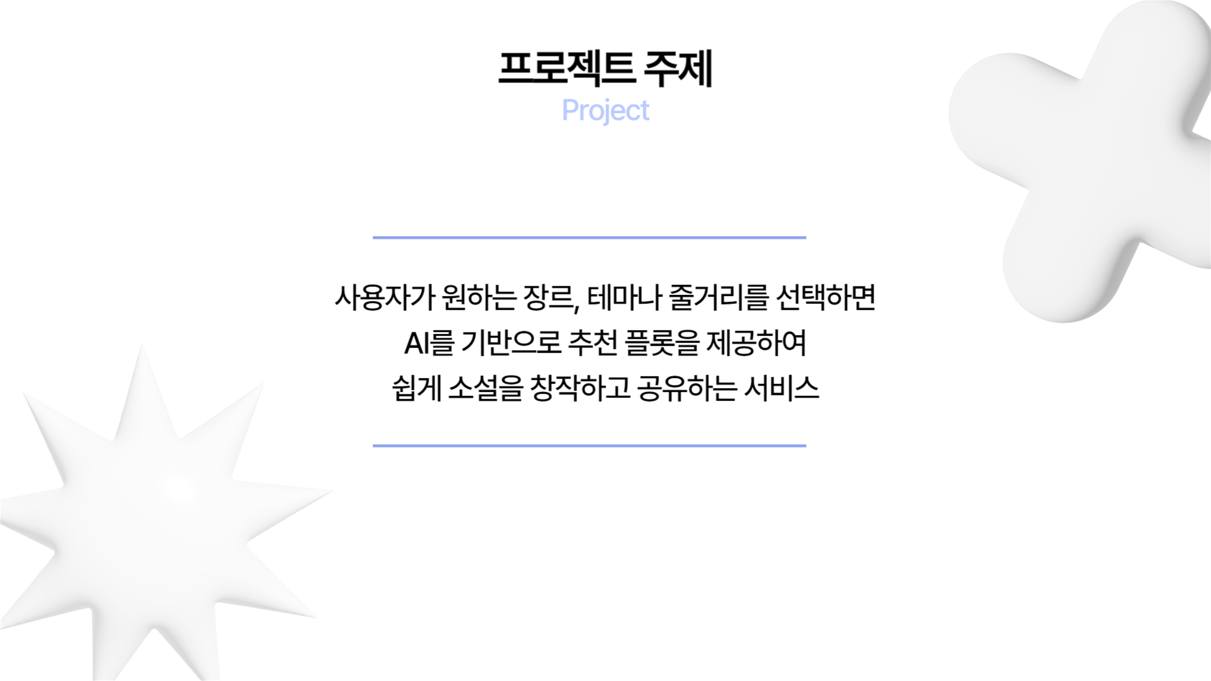 프로젝트 설명 : 사용자가 원하는 장르, 테마나 줄거리를 선택하면 AI를 기반으로 추천 플롯을 제공하여 쉽게 소설을 창작하고 공유하는 서비스