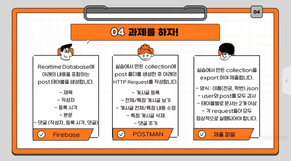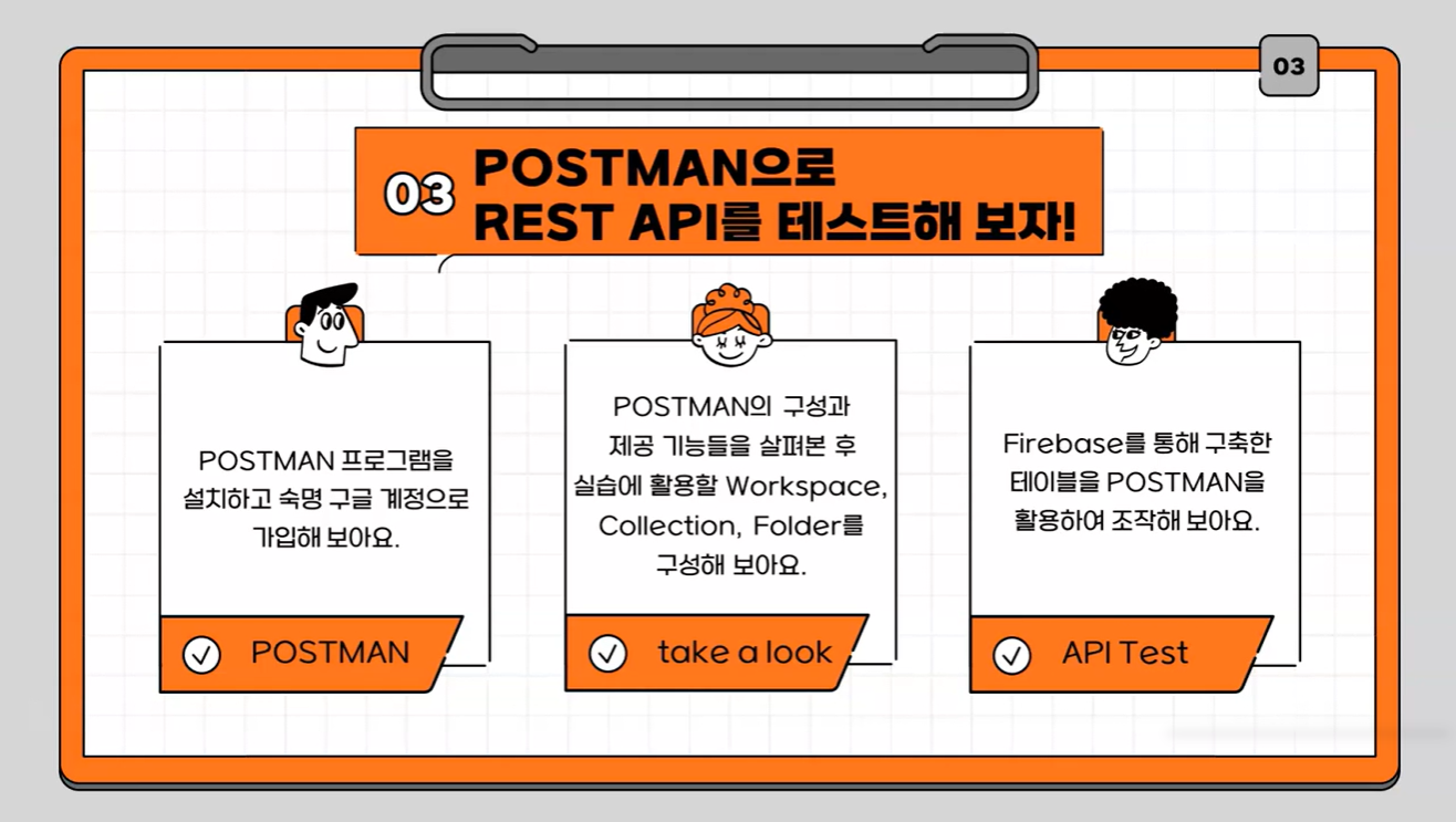[ Firebase와 POSTMAN 활용법을 익혀 REST API 톺아보기 ] 를 어떤 방식으로 풀어나갔는지 함께 확인해볼까요?