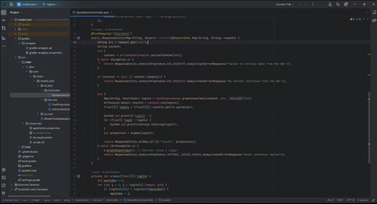 이 때, src/main/resources 디렉터리 아래에 dl/model.onnx 파일이 있어야 합니다.