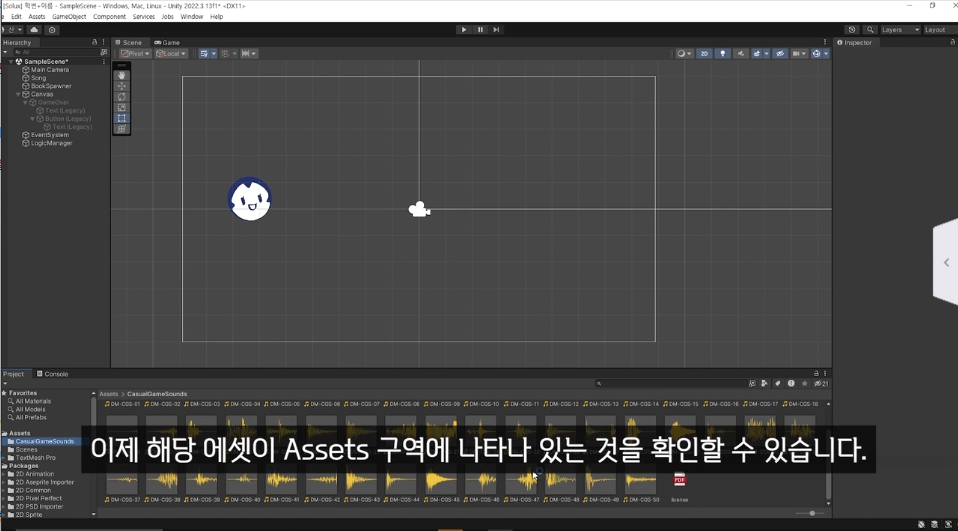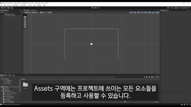 1. Assets (하단): 프로젝트에 필요한 요소(이미지, 오디오 등)를 저장하는 공간