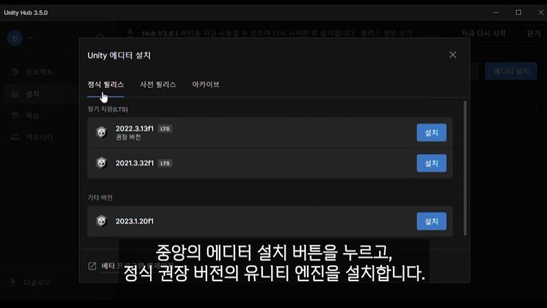 라이선스 적용 후 에디터 설치 버튼을 눌러 LTS(장기 지원 버전) 유니티 엔진을 설치합니다.