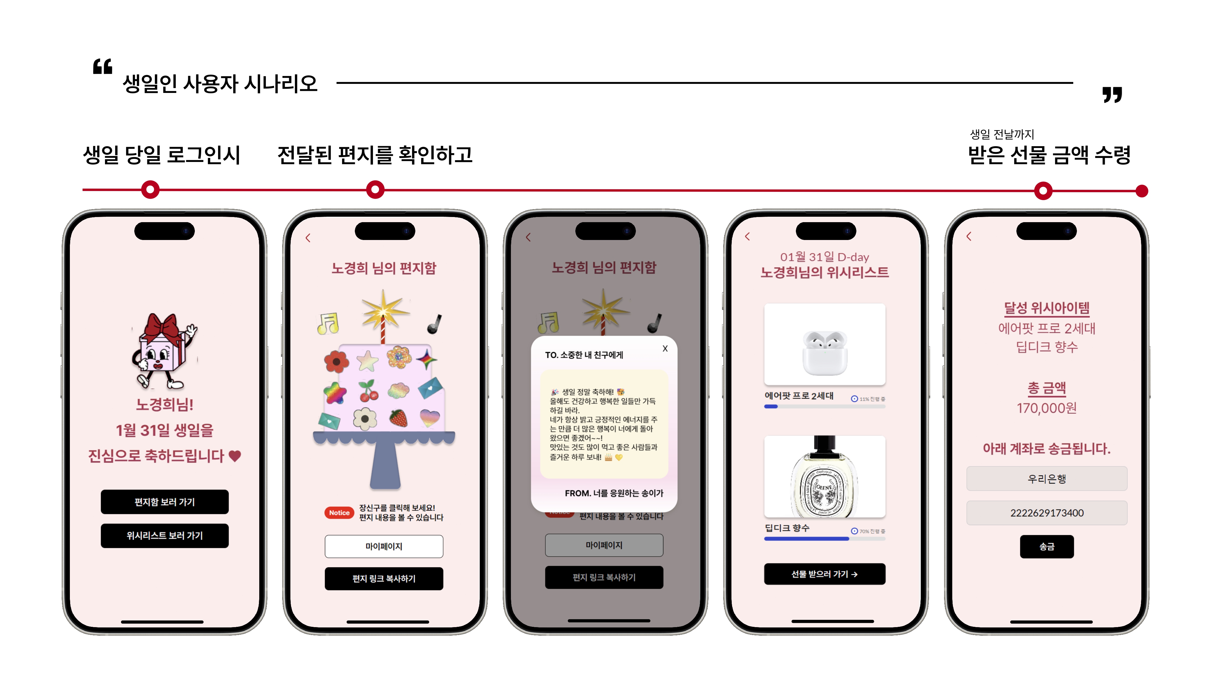 - 편지 아카이빙 : 생일에 받은 편지를 저장하고, 언제든지 열어볼 수 있는 기능