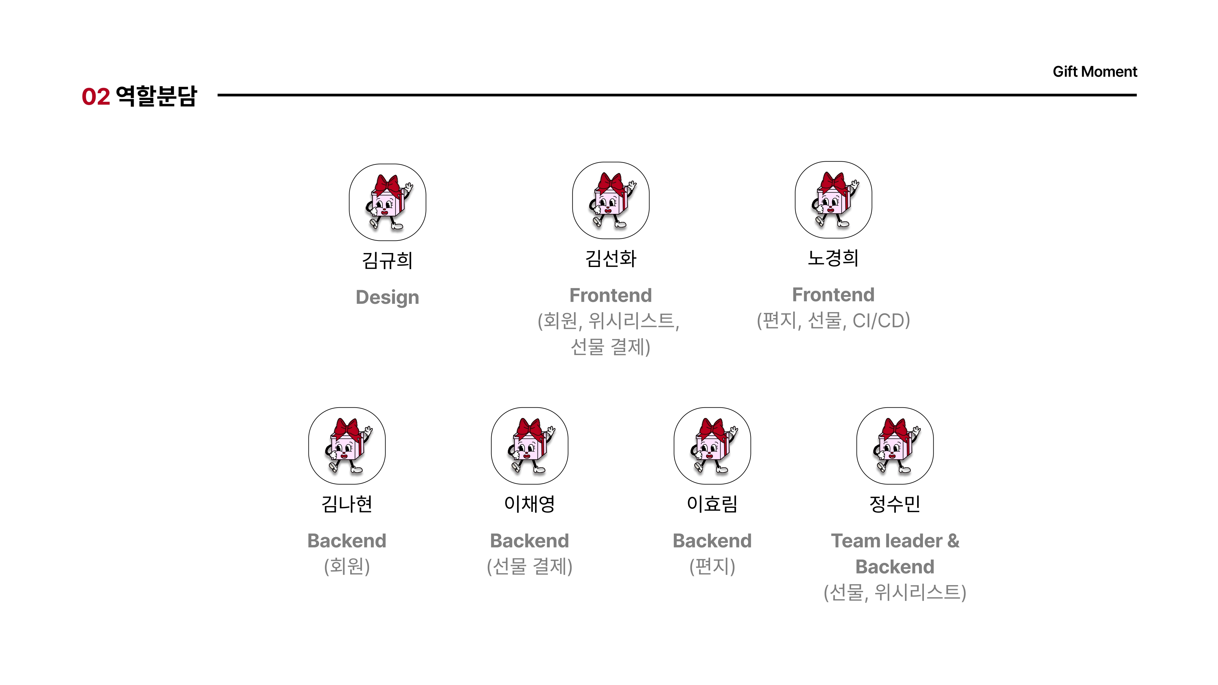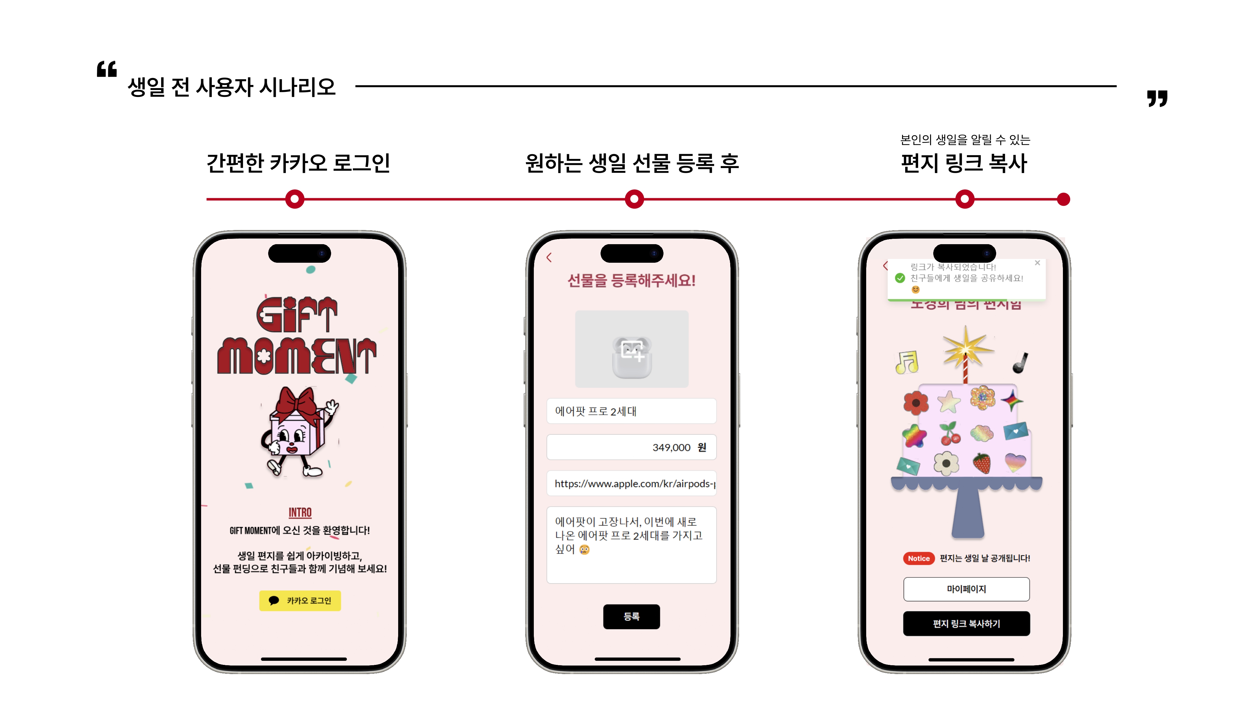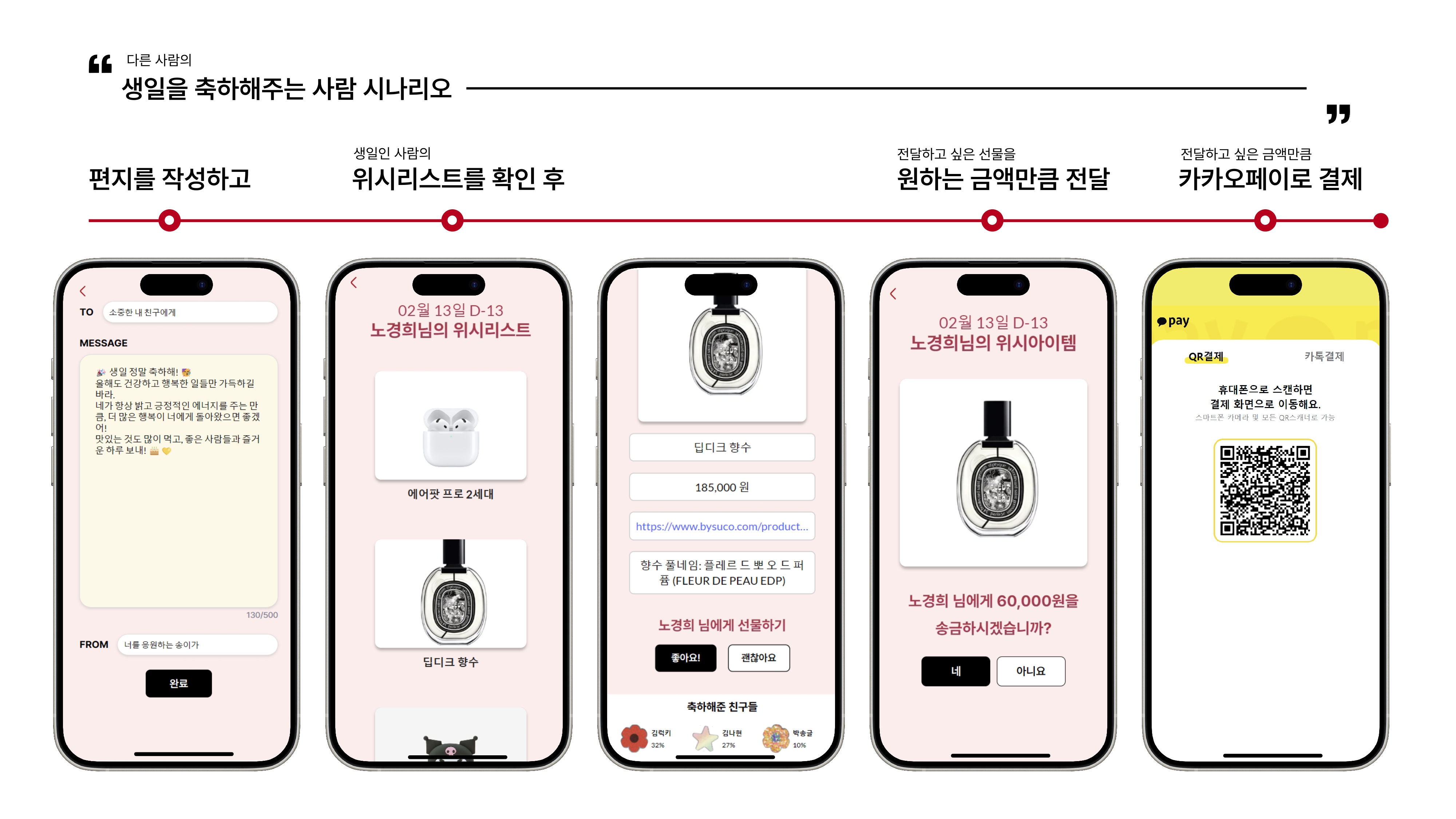 - 선물 펀딩 : 사용자가 원하는 선물을 위시리스트에 등록하면, 친구들이 함께 편딩하여 선물을 준비하도록 해주는 기능