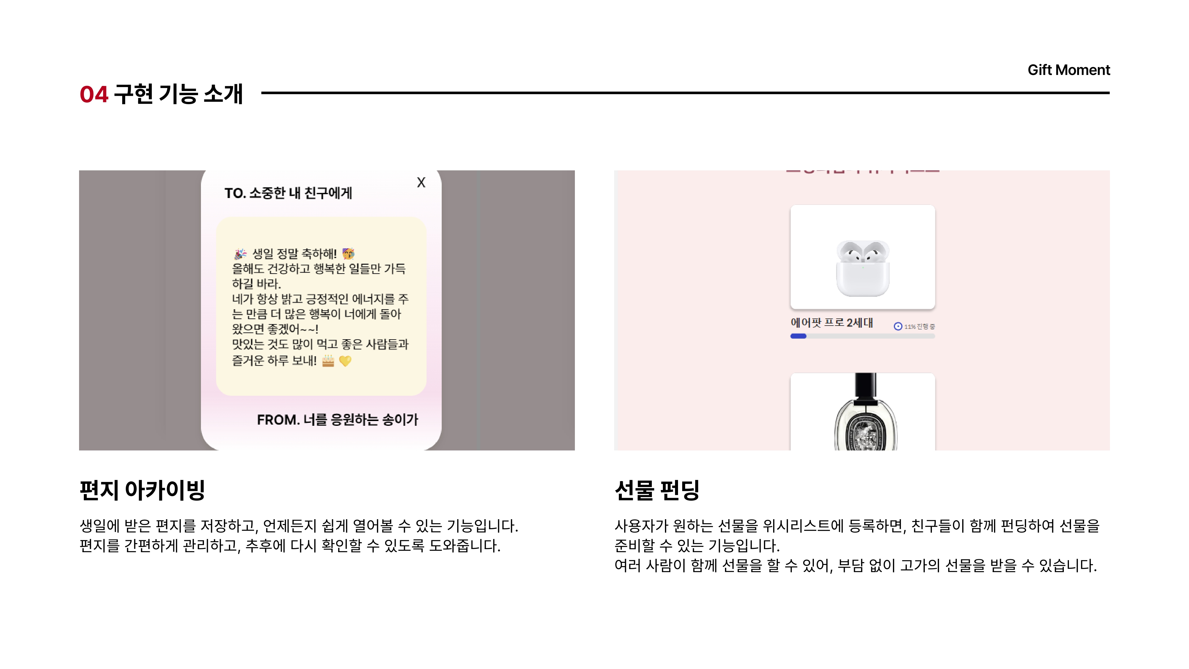 • 선물 펀딩 : 사용자가 원하는 선물을 위시리스트에 등록하면, 친구들이 함께 편딩하여 선물을 준비하도록 해주는 기능
