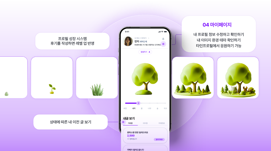 - 마이페이지의 프로필 수정, 이미지 환경 테마 만들기, 응원하기 기능