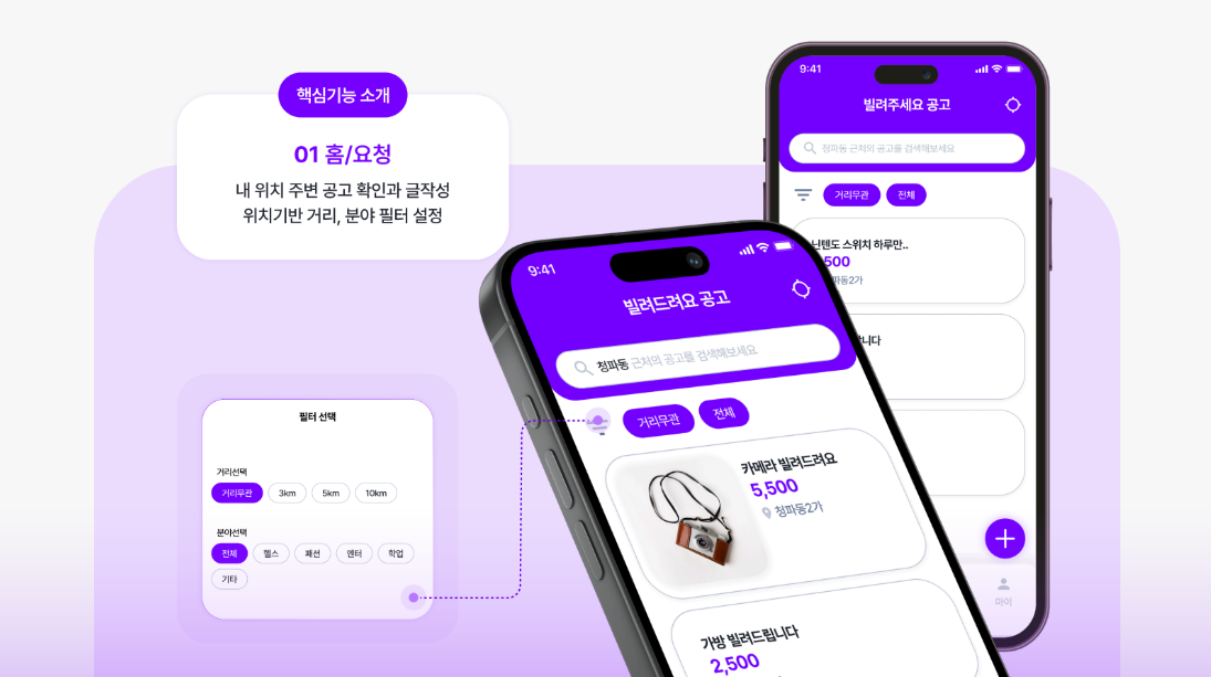 - 홈 및 글작성 위치기반 거리, 분야 필터 설정 기능