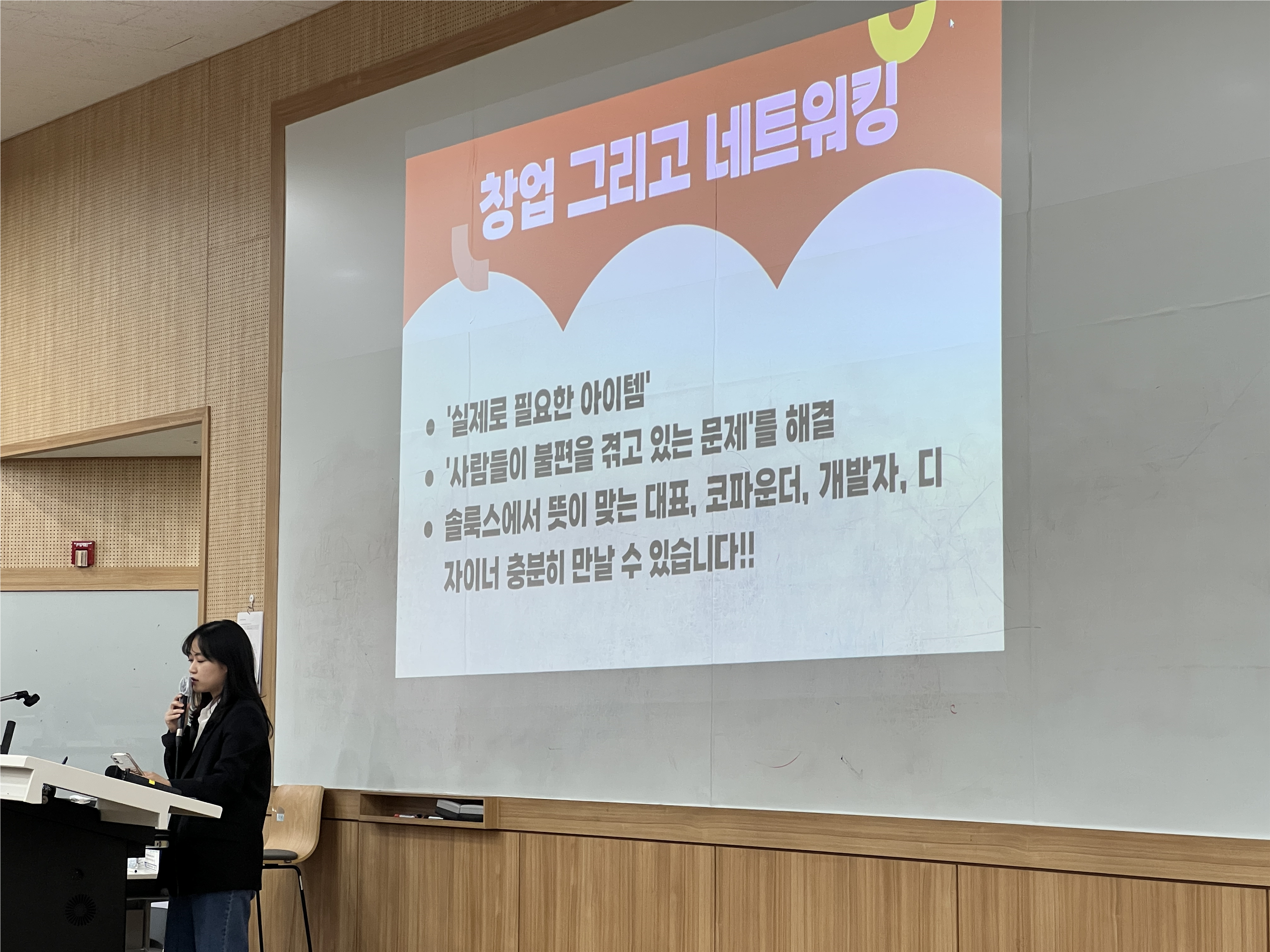 SOLUX에서 맺은 인연을 계기로 창업 프로젝트 팀을 구성하고, 현재 Epicode 스타트업의 코파운더이자 프론트엔드 개발자로 활동 중이신 김민진 멘토님께서는 SOLUX 활동을 통해 얻은 소중한 경험과 인적 네트워크, 그리고 창업 과정에서 체득한 통찰과 실질적인 조언을 중심으로 강연해 주셨습니다.