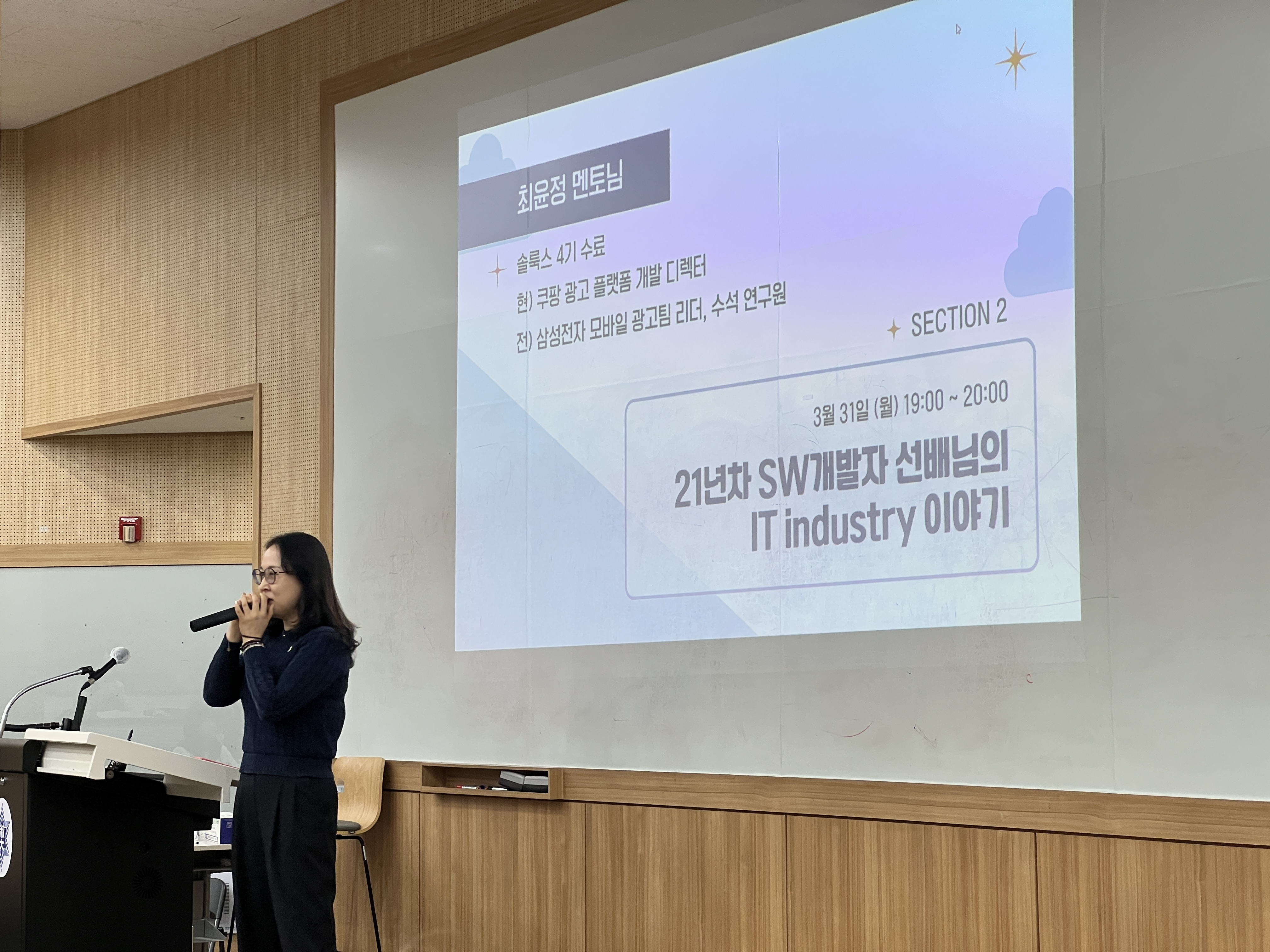 삼성전자 모바일 광고팀 리더 및 수석 연구원을 거쳐 현재 쿠팡에서 광고 플랫폼 개발 디렉터로 재직 중이신 최윤정 멘토님께서 IT 기업들이 요구하는 인재상과 우리가 갖추어야 할 역량과 함께 끊임없이 변화하는 IT Industry 속에서 우리에게 필요한 자세를 중심으로 강연해 주셨습니다.