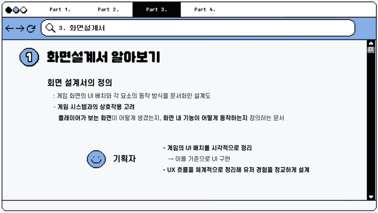 화면설계서는 게임 화면의 UI 배치와 각 요소의 동작 방식을 문서화한 설계도입니다.
