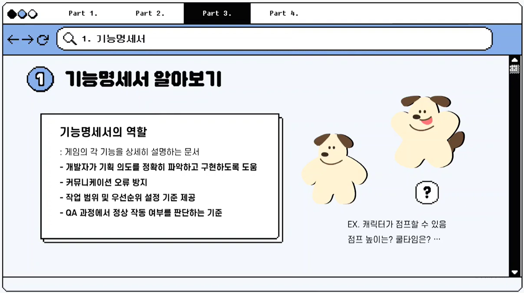 게임 개발이란 게임의 내용과 시나리오, 게임 로직을 구성하는 코드를 비롯해 아트/사운드 리소스를 제작하는 전반적인 과정을 의미합니다. 이 때 다양한 콘텐츠와 시스템이 상호작용한다는 점을 고려해 작은 단위로 QA와 수정을 반복하는 것이 중요합니다.