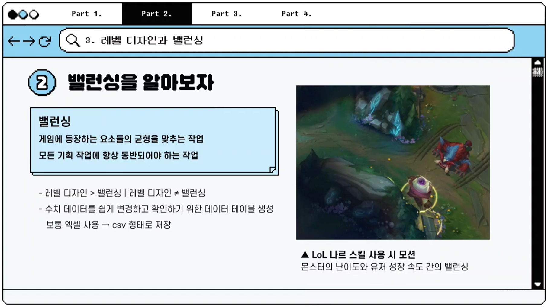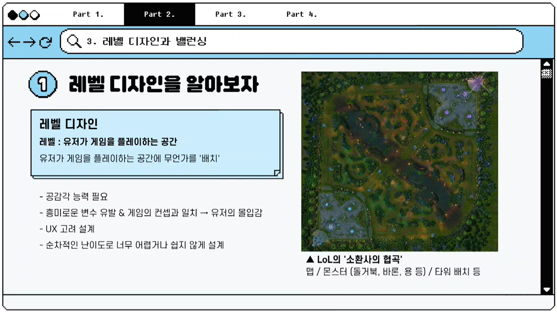 레벨 디자인은 유저가 게임을 플레이하는 공간을 설계하는 작업입니다. 이는 흥미로운 변수를 유발해 몰입감을 높이고, UX를 고려한 설계가 필요하기에 밸런싱과 밀접한 관련이 있습니다.