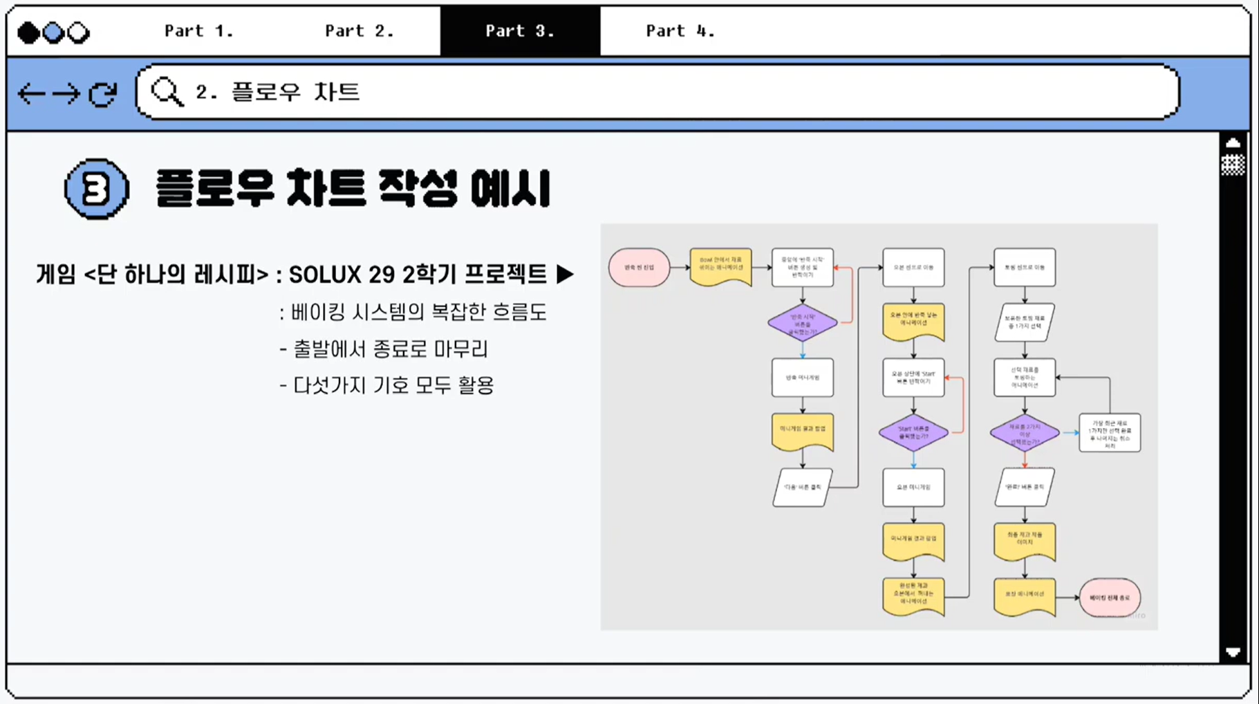 플로우 차트는 게임 내 시스템과 콘텐츠의 동작 흐름을 도형과 화살표를 이용해 시각적, 도식적으로 표현한 다이어그램입니다.