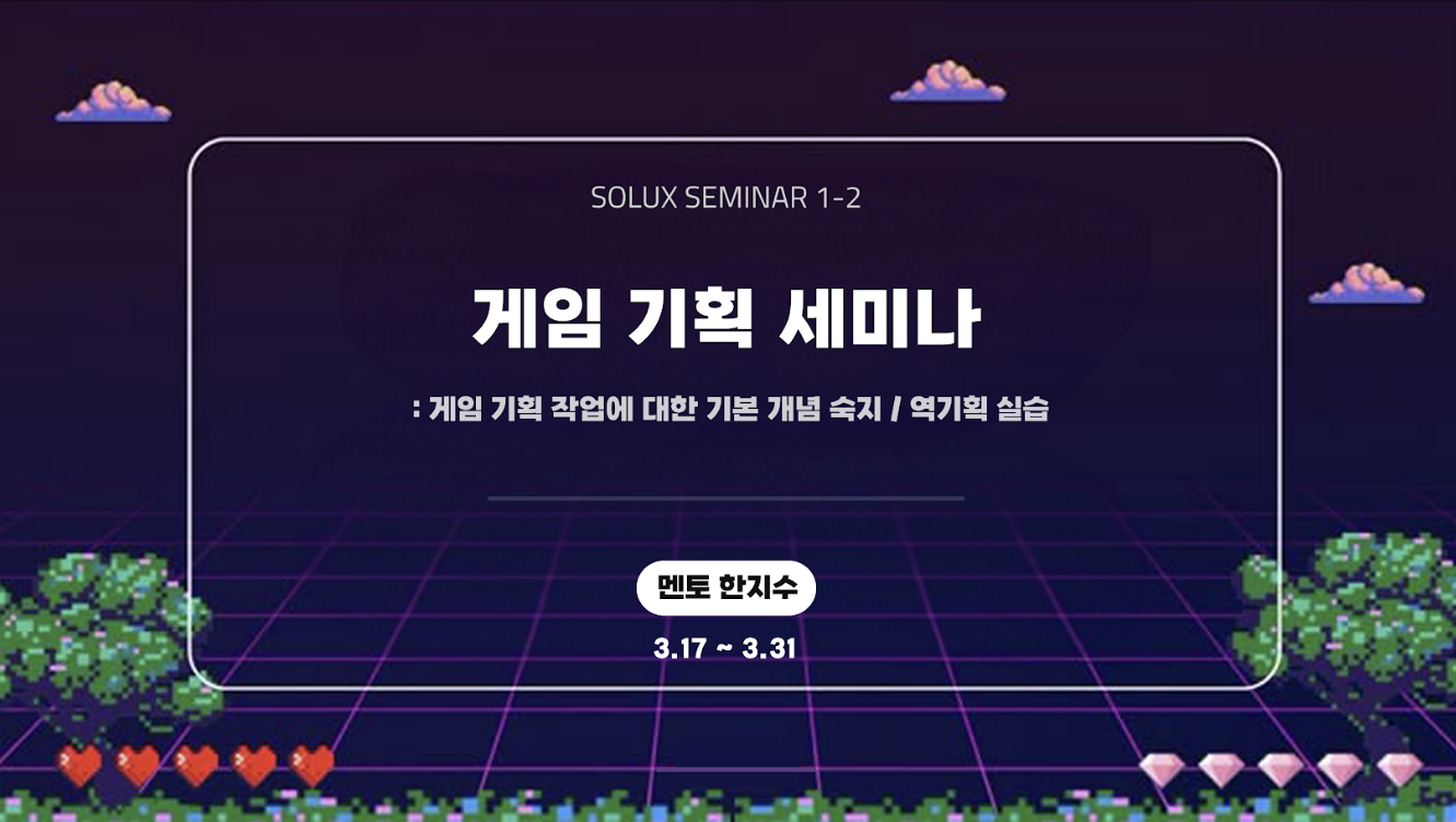 게임 기획 세미나를 수강한 SOLUX 부원들은 채점 기준에 맞춰 자신만의 개성이 담긴 기획안을 성실히 제출해 주셨습니다.