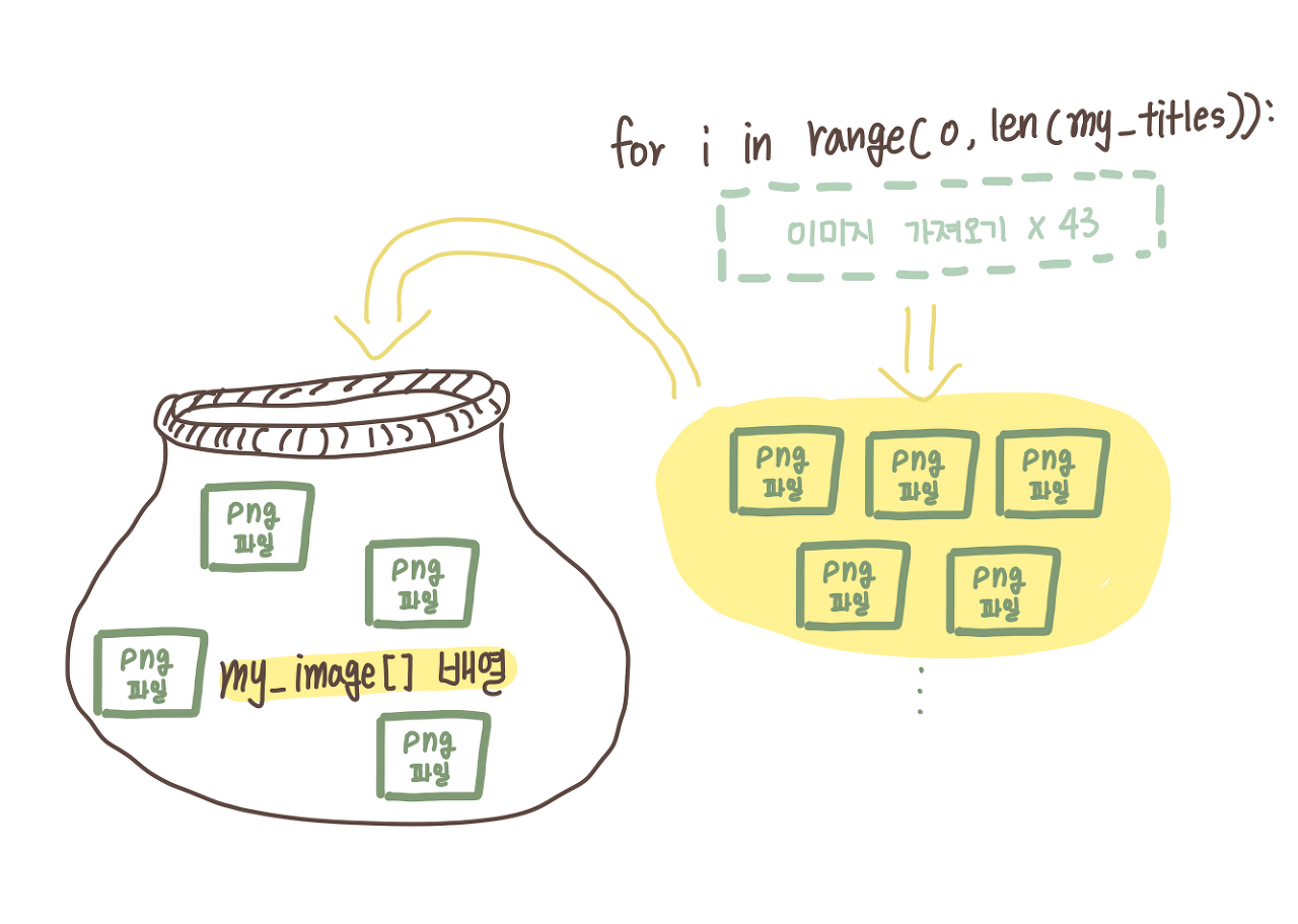 # 이미지를 가져와 my_images 바구니(배열)에 잠시 보관하는 것을 43번 반복합니다.