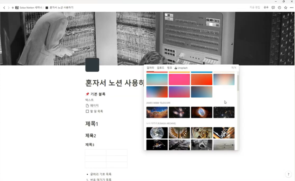 노션의 기초 사용법부터 데이터 베이스 활용, 협업을 위한 심화 기능까지 단계적으로 폭넓게 다루었습니다.