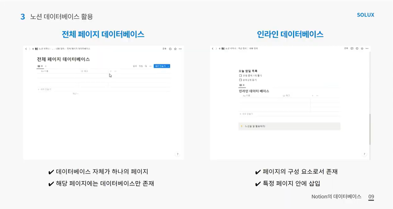 노션의 데이터베이스는 컬럼과 행으로 구성된 관계형 구조이며, 앞뒤에 다른 블록을 배치할 수 있는지에 따라 전체 페이지 데이터베이스와 인라인 데이터베이스로 구분됩니다.