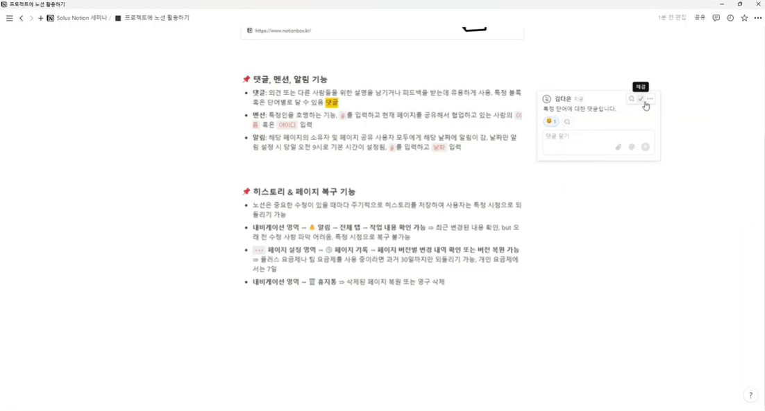 또한, 다른 사용자의 페이지나 템플릿 가져오기, 댓글/멘션/알림 기능, 히스토리 및 페이지 복구, 외부 앱 연동 등 프로젝트에 유용한 다양한 기능들도 함께 알아보았습니다.