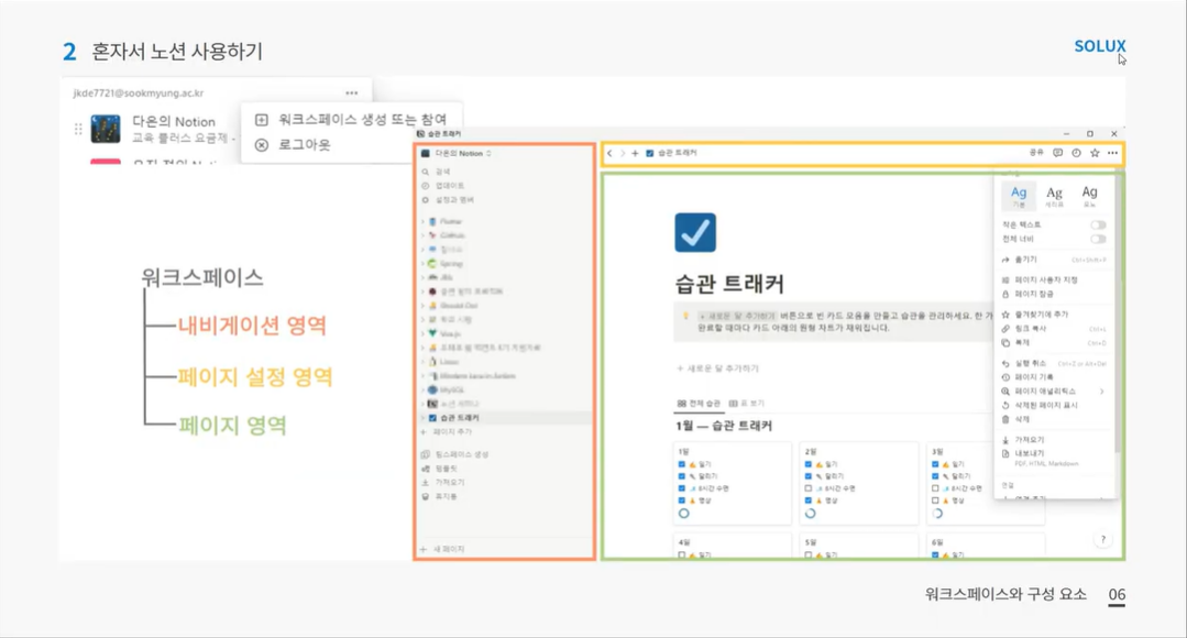 노션의 워크스페이스는 내비게이션 영역, 페이지 설정 영역, 그리고 페이지 영역으로 구성됩니다.