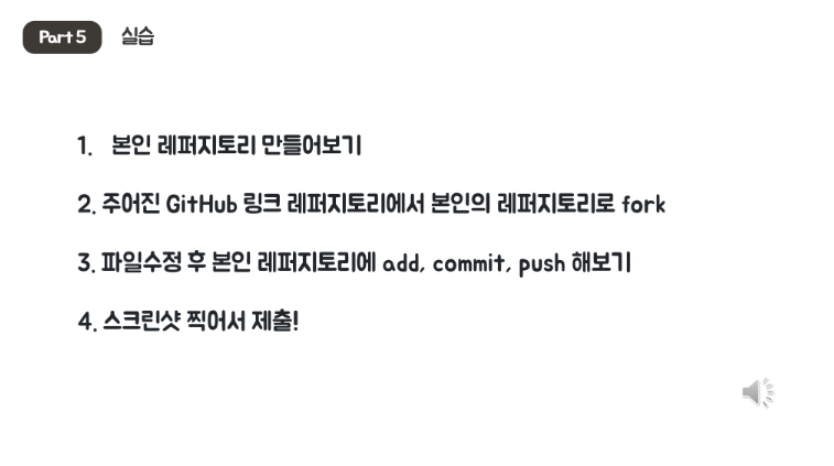 1차 세미나 학습이 끝난 뒤에는 간단한 과제를 통해 실제로 깃과 깃허브를 활용해보는 실습을 진행하였습니다.