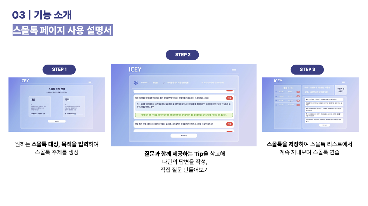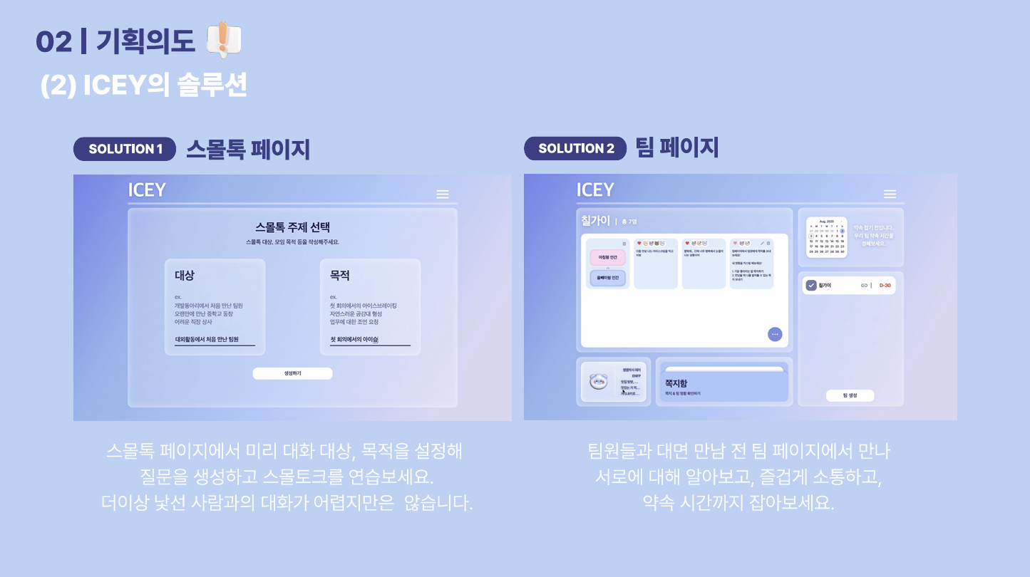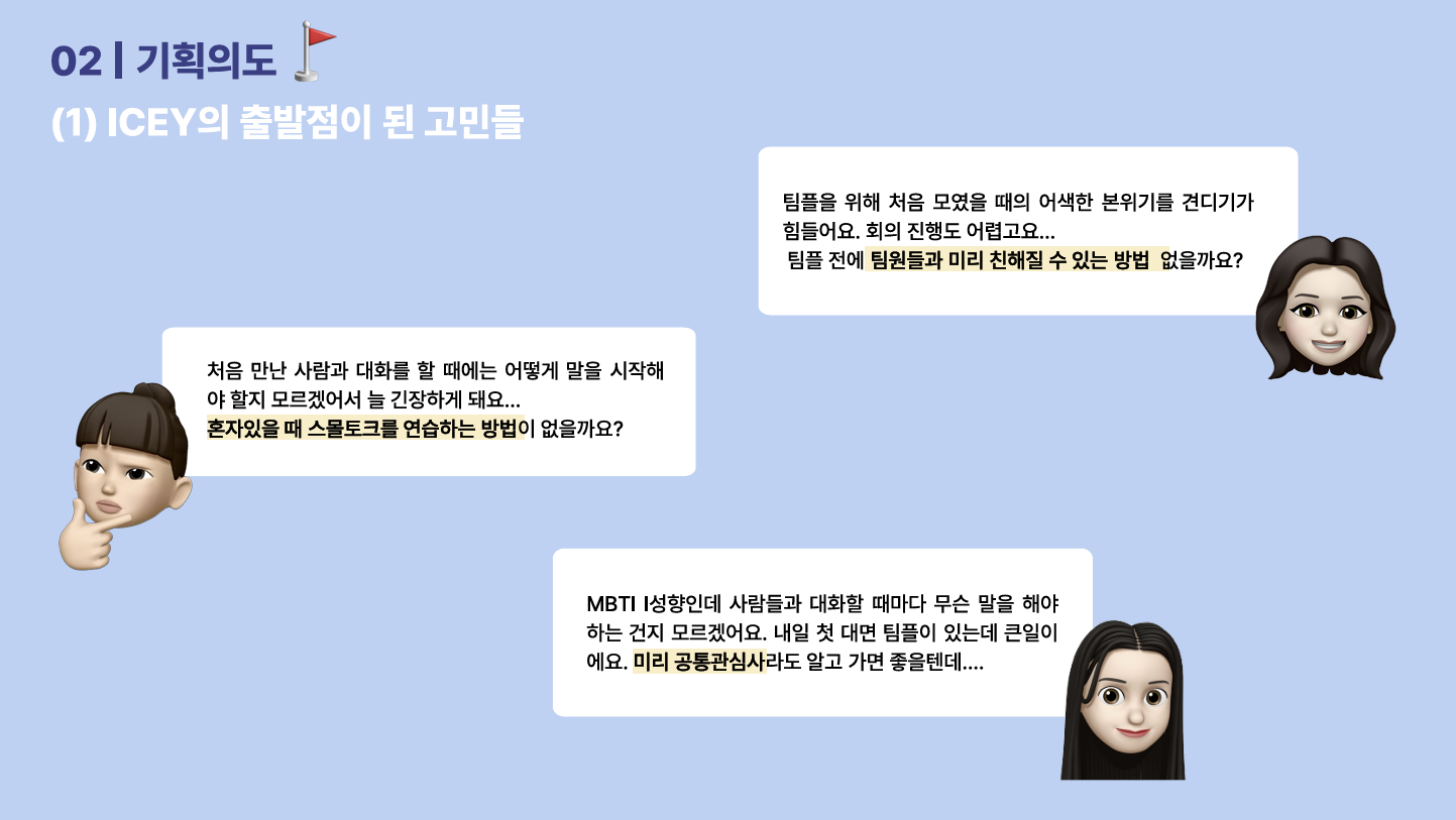 프로젝트 설명 : 어색한 첫 대화를 준비하는 가장 귀여운 방법, 스몰토크&아이스브레이킹 서비스 ICEY