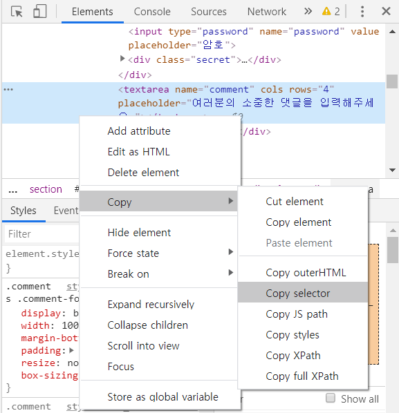 댓글창의 html 코드에서 우클릭 > Copy > Copy selector를 눌러 정보를 복사해줍니다.