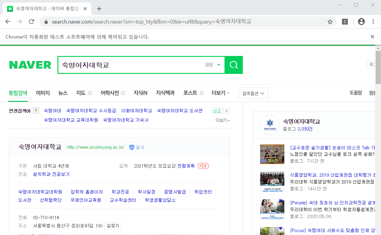 앞의 강의에서 사진과 같이 네이버에 숙명여자대학교를 검색해 보았는데요.