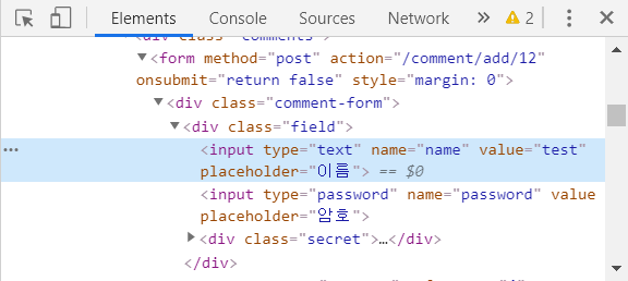 이번에는 이름과 비밀번호의 요소를 찾고, 입력하는 과정에 name을 이용해 보겠습니다.