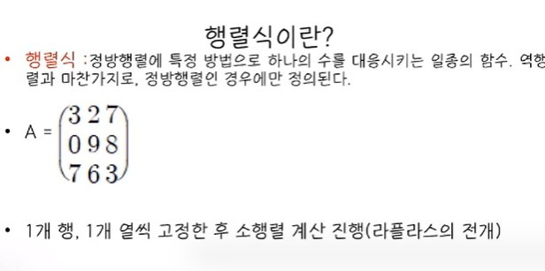 행렬식이란 정방행렬에만 정의되는 함수로, 행렬 한 개를 하나의 수로 대응시켜 주는 개념입니다.