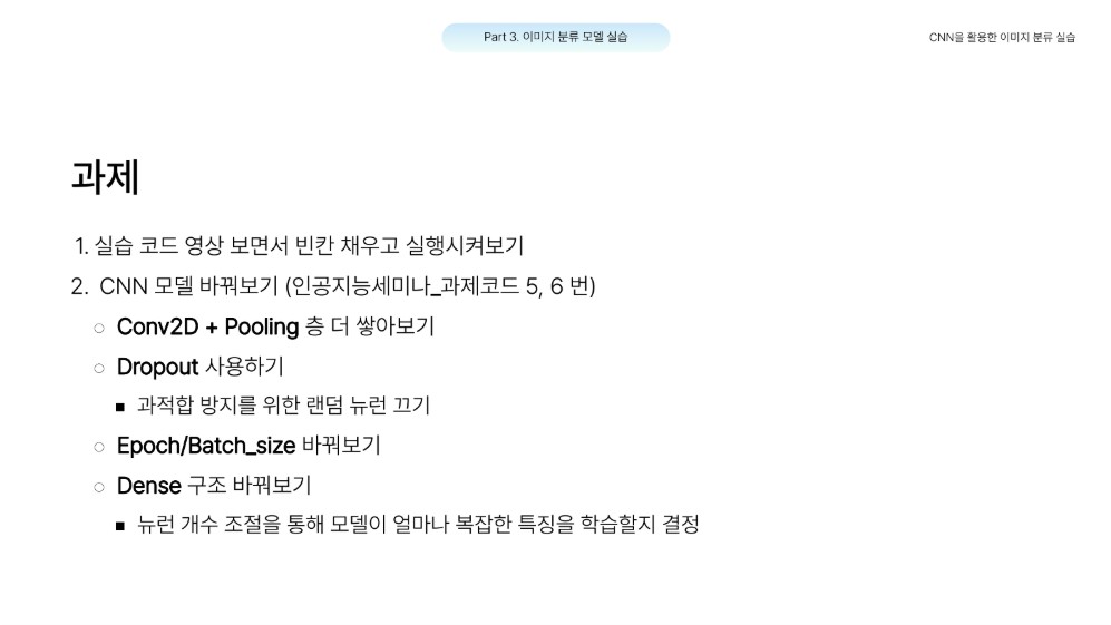 Conv2D와 Pooling 층을 추가하거나 Dropout을 적용하는 등 다양한 방식으로 모델 구조를 바꾸어보는 과제를 수행하였습니다.