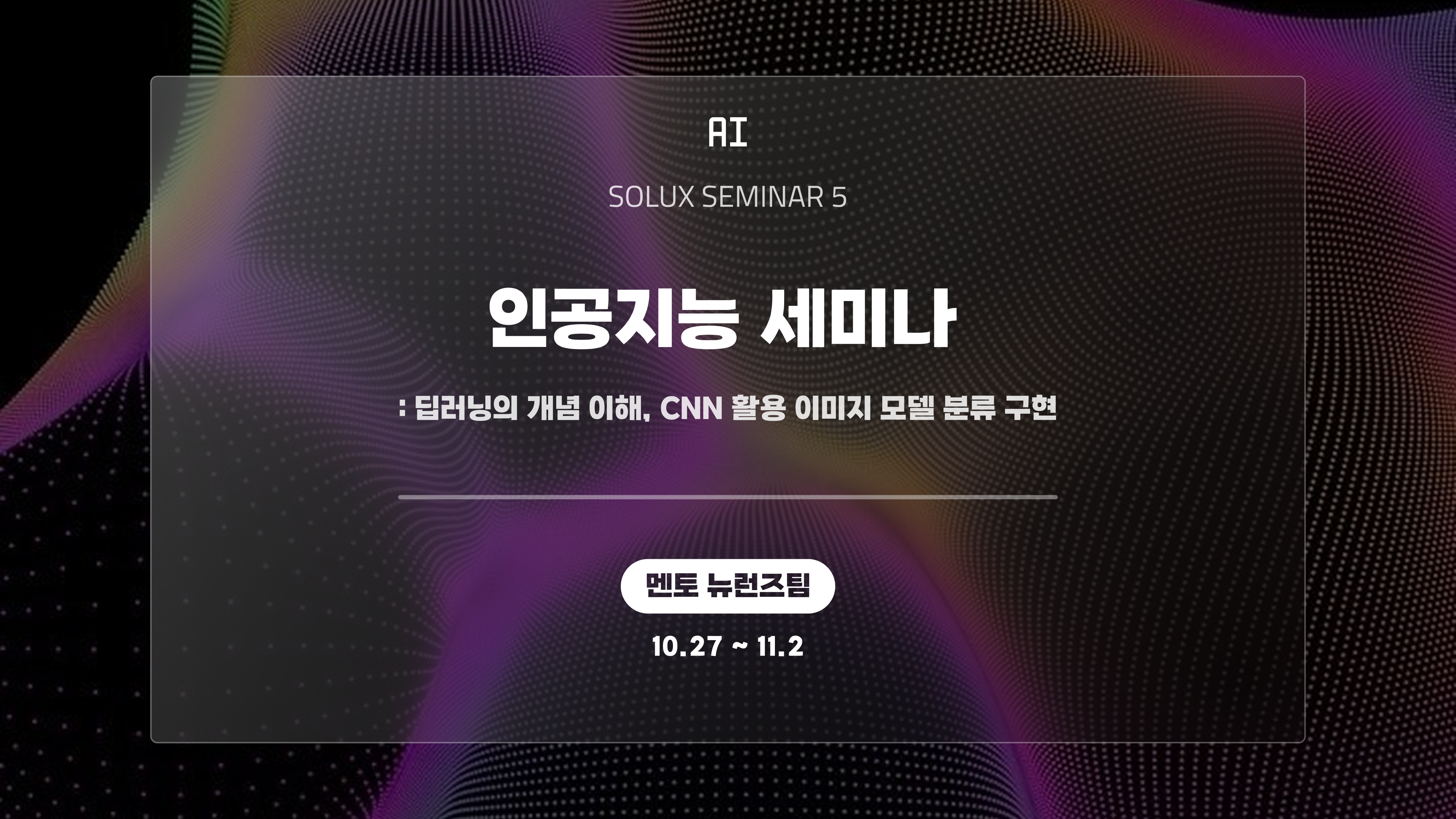 이번 5차 세미나에서는 딥러닝의 기본 개념을 이해하고, CNN을 활용해 이미지 분류 모델을 구현해보는 시간을 가졌는데요