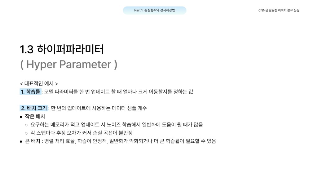 사용자가 직접 설정해야 하는 값들로 대표적으로 학습률, 배치 크기, 에폭 수 등이 있습니다.