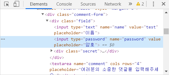 비밀번호 칸의 html 코드는 name이 "password"로 지정되어 있네요.
