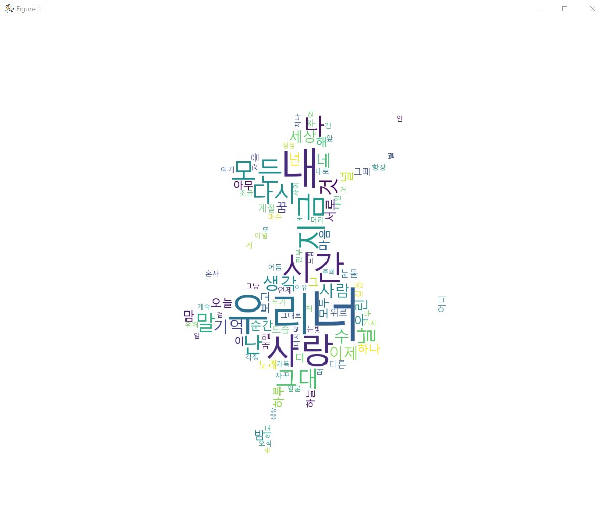 실행하면 조금 오래걸리지만 top 100의 노래가사를 가져와 워드 클라우드가 그려집니다!