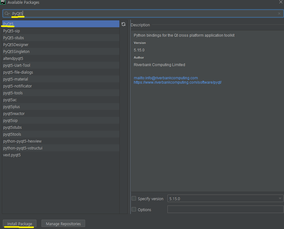 4. PyQt5를 검색한 뒤 Install Package를 클릭합시다!