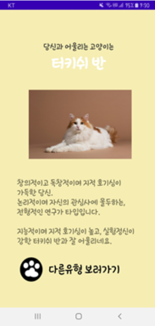 - 결과 화면 : 16종류의 고양이 중 응답 결과에 따라 해당하는 고양이를 보여줍니다. 고양이의 이름, 사진과 함께 간단한 성격을 소개합니다.