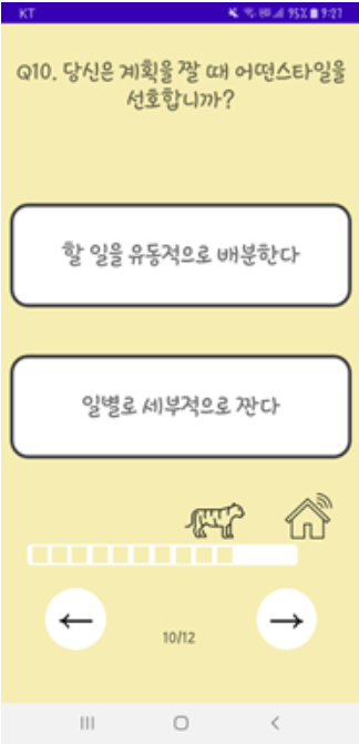 - 질문 화면 : 두 개의 선택지를 가진 12개의 질문으로 구성되어 있고, 진행도를 나타내는 막대와 이전 문항, 다음 문항으로 갈 수 있는 이동 버튼이 있습니다.
