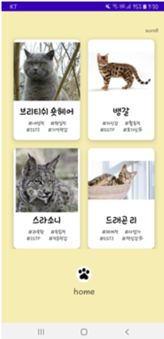 - 다른 유형 보기 : 스크롤을 내리며 볼 수 있도록 구성하였고, 16종의 고양이에 대해 간단한 소개가 포함되어 있습니다.