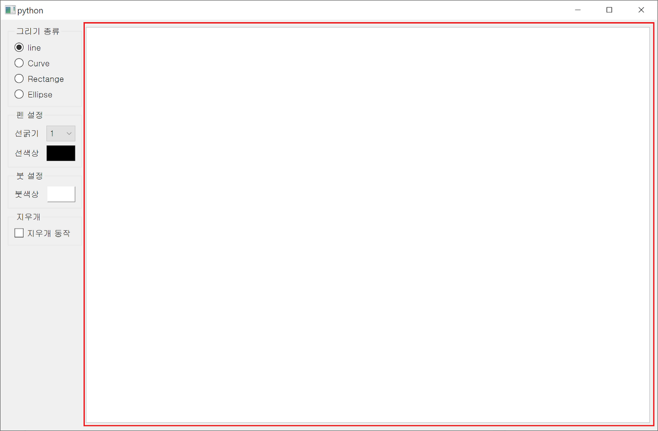 먼저지우개 모드인 경우, 바로return None을 사용해서 다음 그리기 동작이 일어나지 않도록 합니다. 그리고 곡선 그리기를 제외한 다른 그리기 모드인 경우, 마우스 클릭을 해제했을 때 최종적으로마우스 클릭 해지시 완성된 그림을 그리도록 합니다. 마지막으로 곡선 그리기 모드의 경우, 마우스를 움직일 때마다 짧은 선을 이어 붙여 곡선을 그려가므로 마우스 클릭을 해제했을 때 새로 그릴 필요는 없습니다.