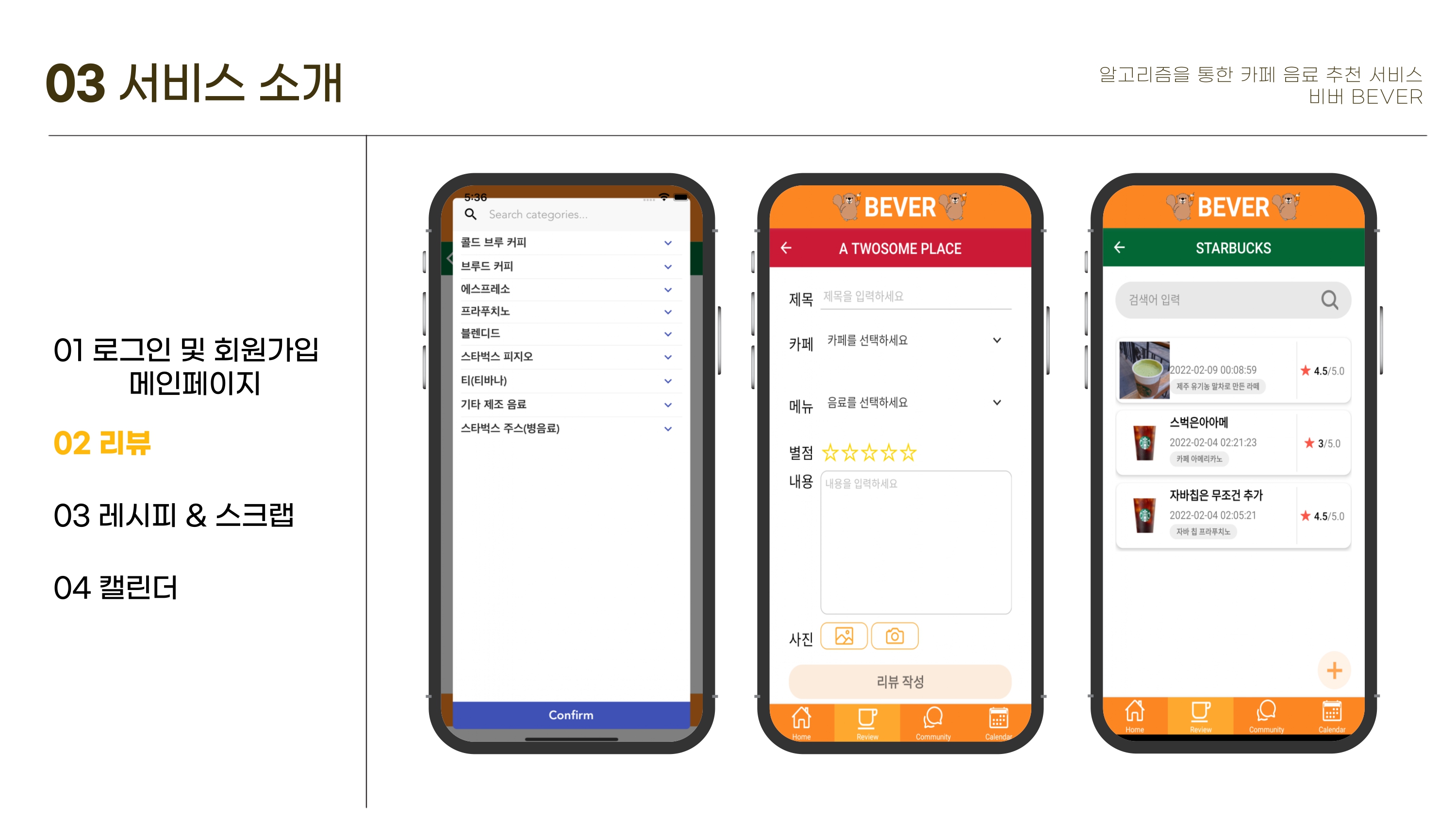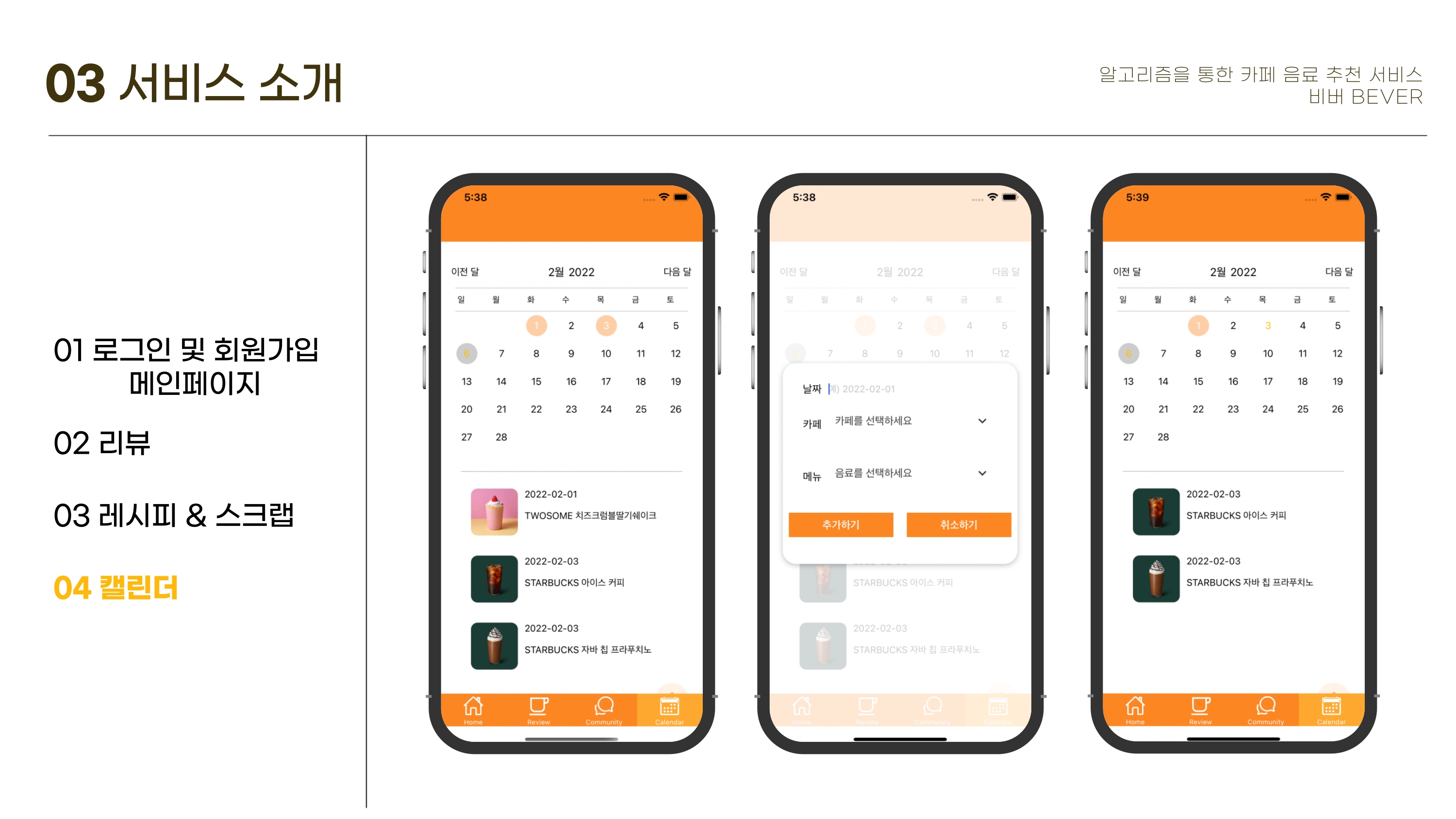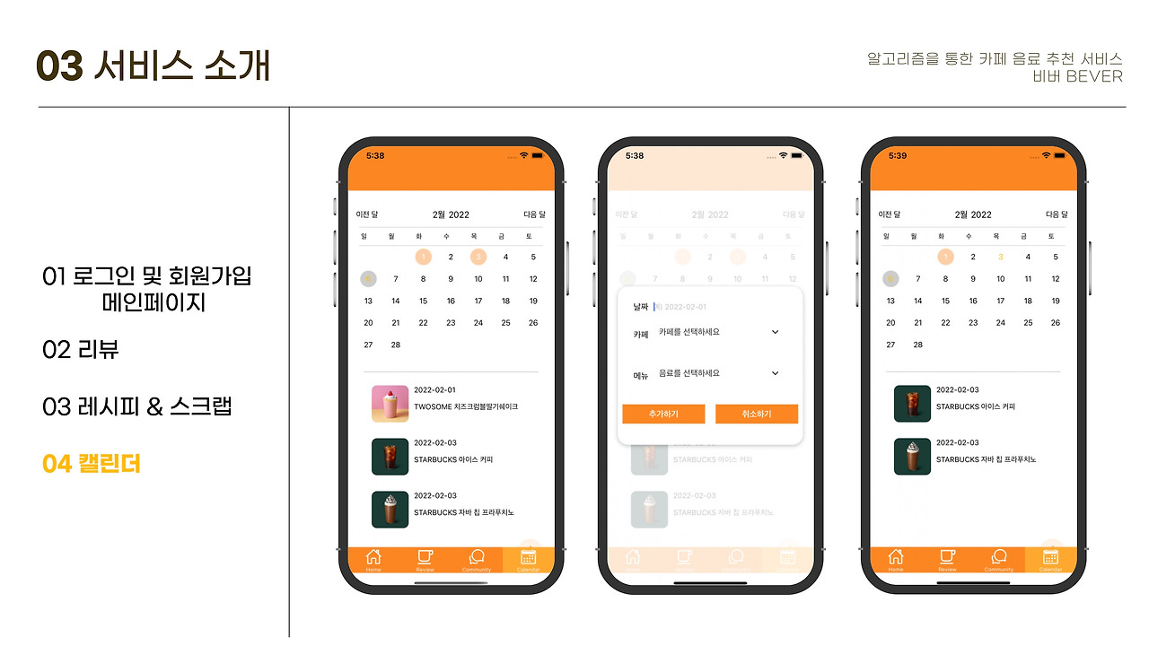 - 리뷰도 올릴 수 있고 캘린더에 음료를 기록할 수 있는 기능