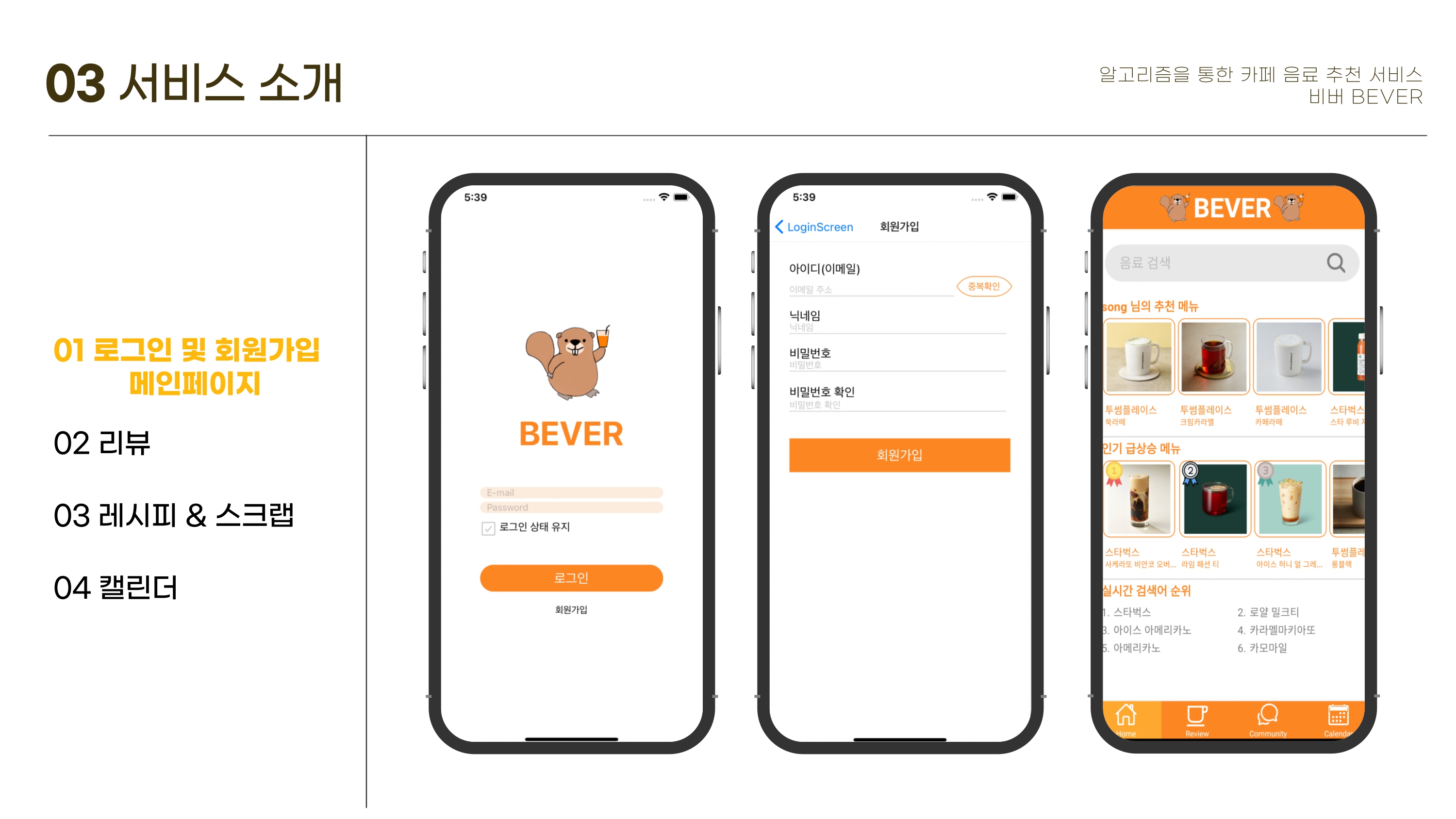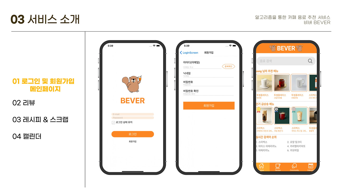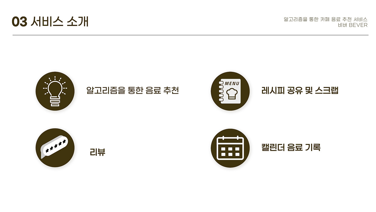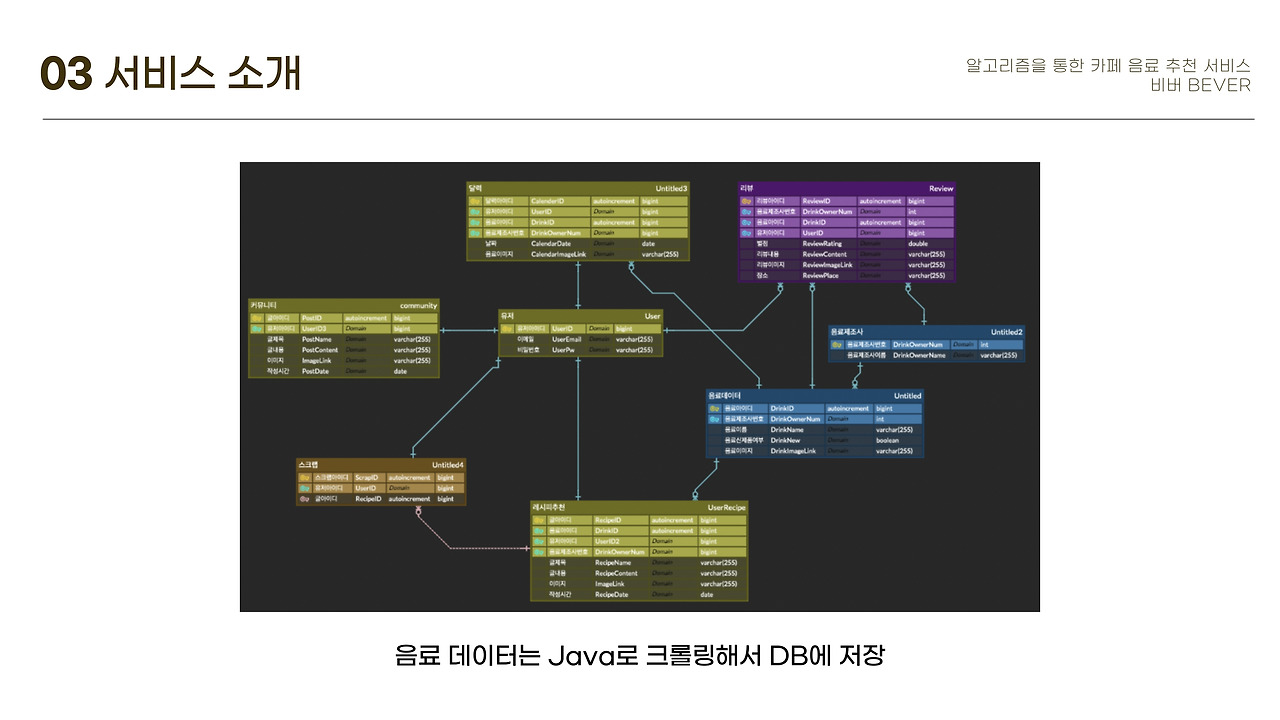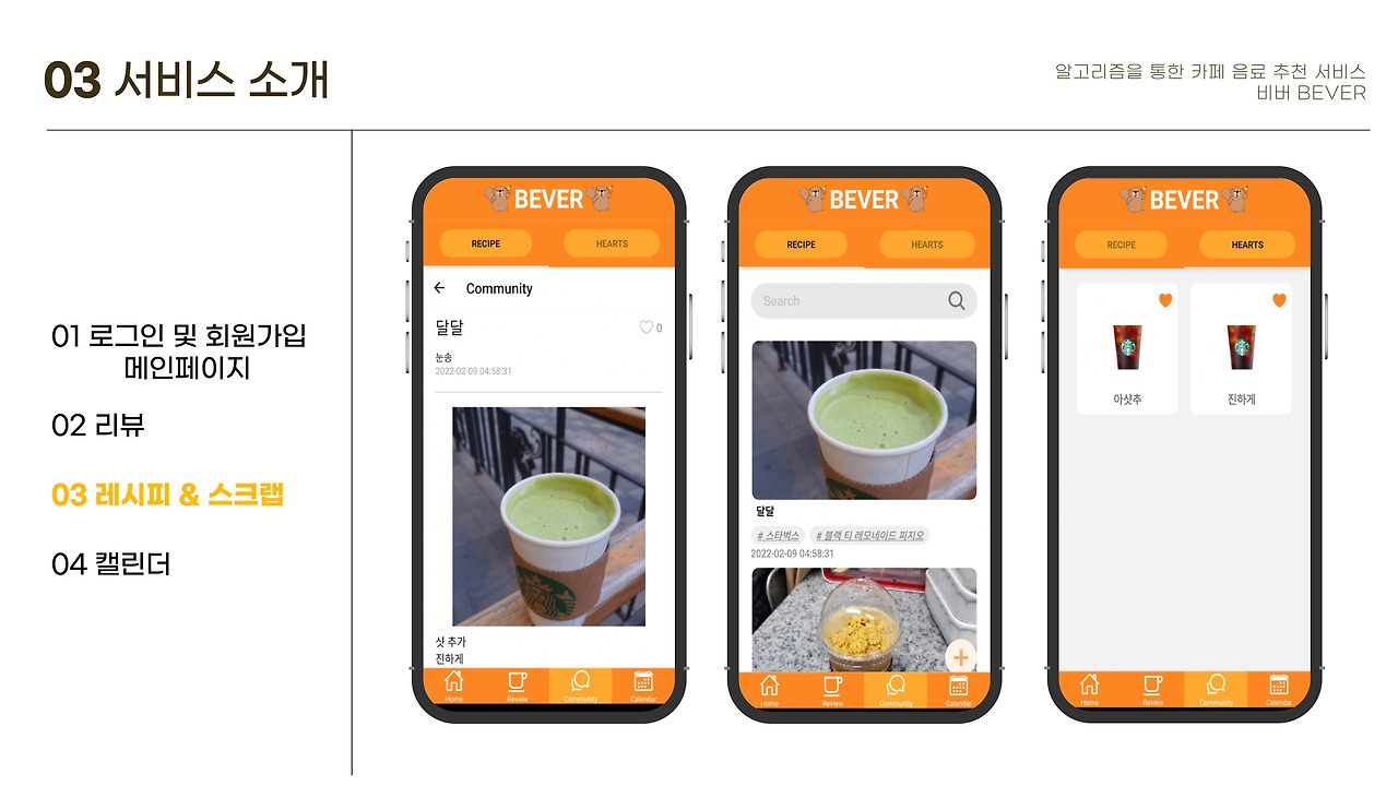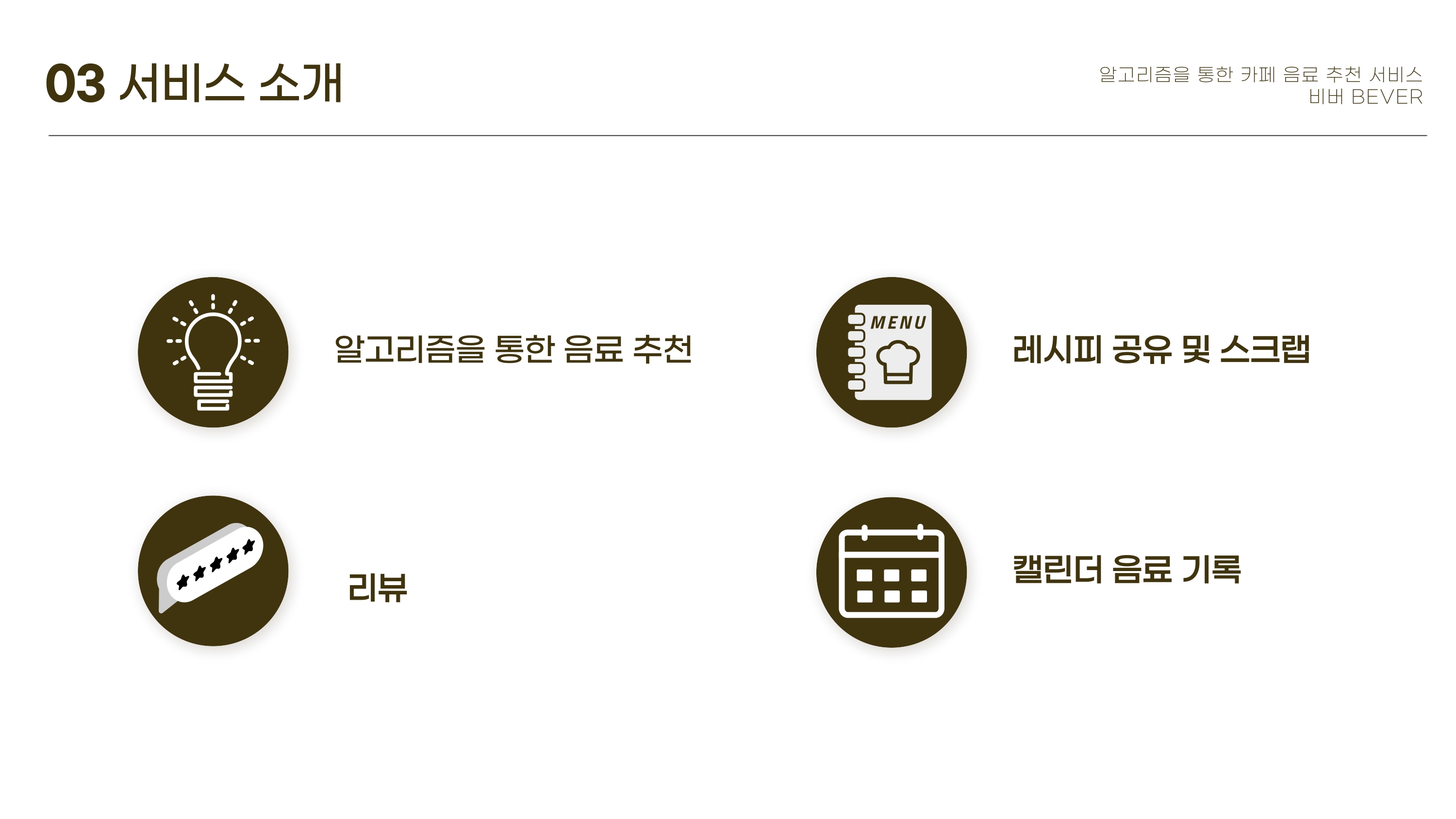 - 사용자의 취향에 맞는 음료 추천이 가능하고 사용자간 음료 후기와 추천 레시피 공유 기능